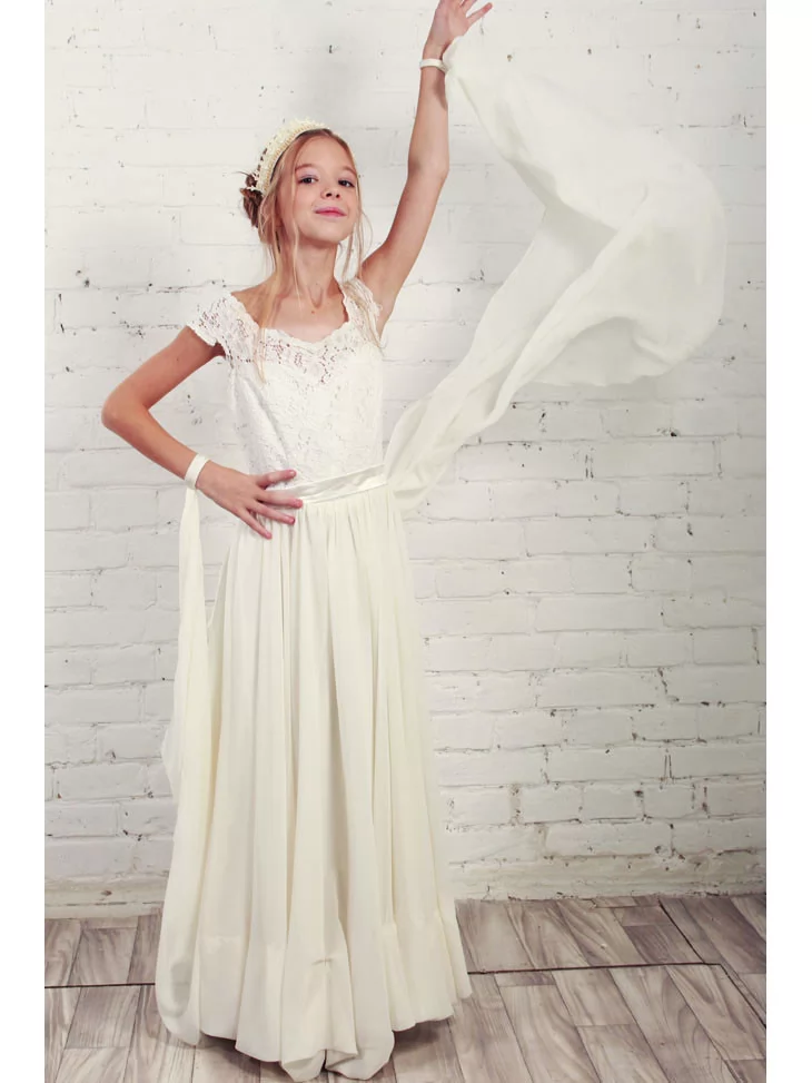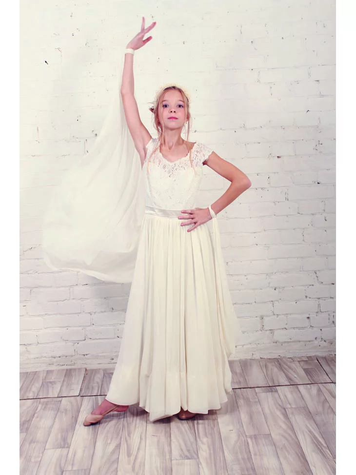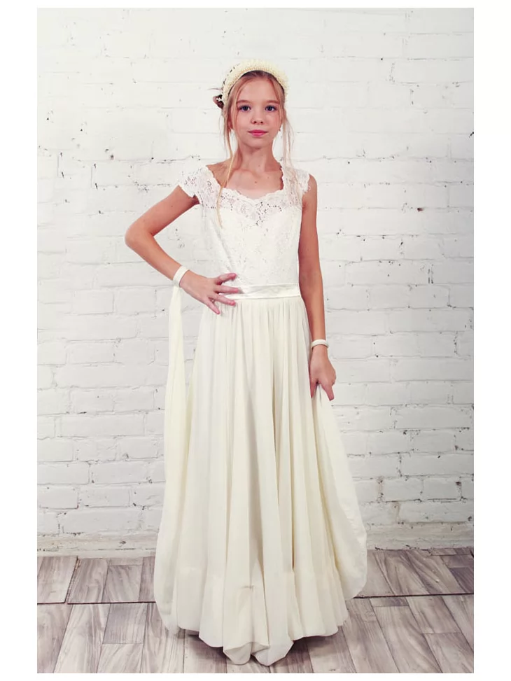 Ніжна, витончена та дуже святкова сукня створює образ юної леді з казковою елегантністю. Мереживний верх красиво підкреслює силует, а довга м’яка спідниця струменіє при русі, додаючи легкості та повітряності образу. Це ідеальний вибір для оренди карнавальних костюмів на урочистості, фотосесії та особливі події.