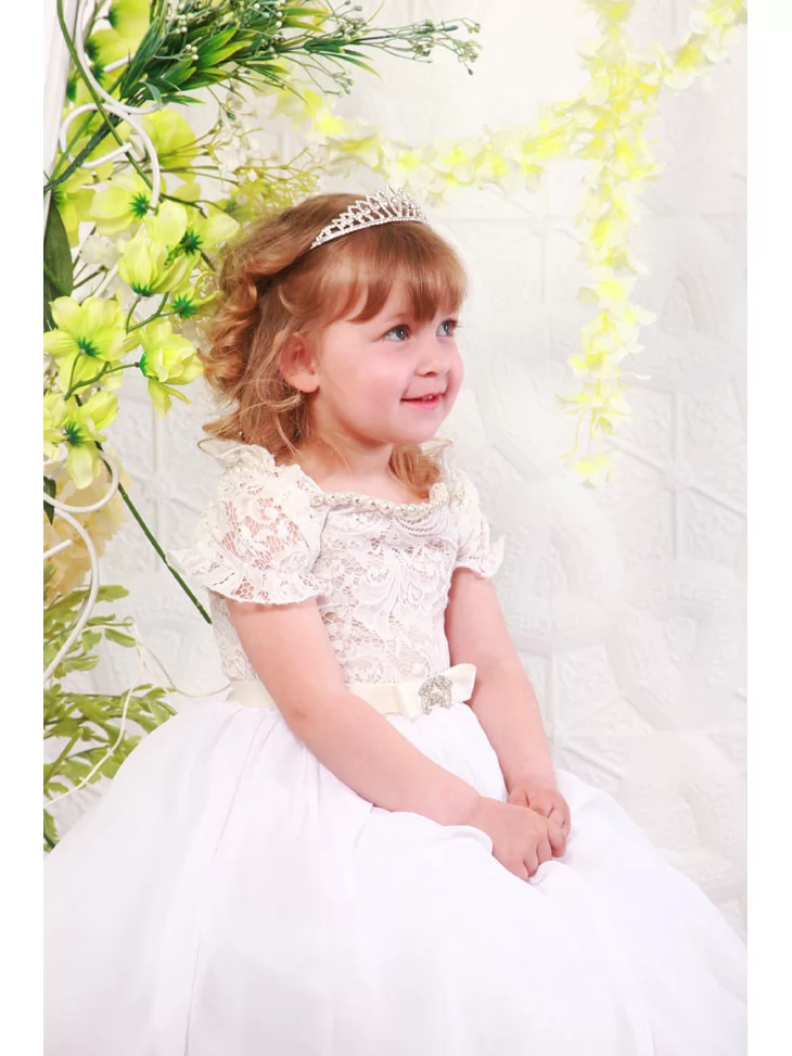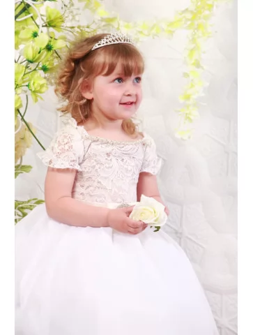Легкий, повітряний образ для маленької леді, що виглядає наче з чарівної історії про бал і королівський палац. Мереживний верх із делікатними візерунками поєднується з пишною спідницею з м’якого фатину, створюючи ніжний та урочистий силует. Сукня виглядає дуже святково, водночас залишається зручною для дитини. Це чудовий вибір для оренди карнавальних костюмів на ранки, фотосесії та особливі події.