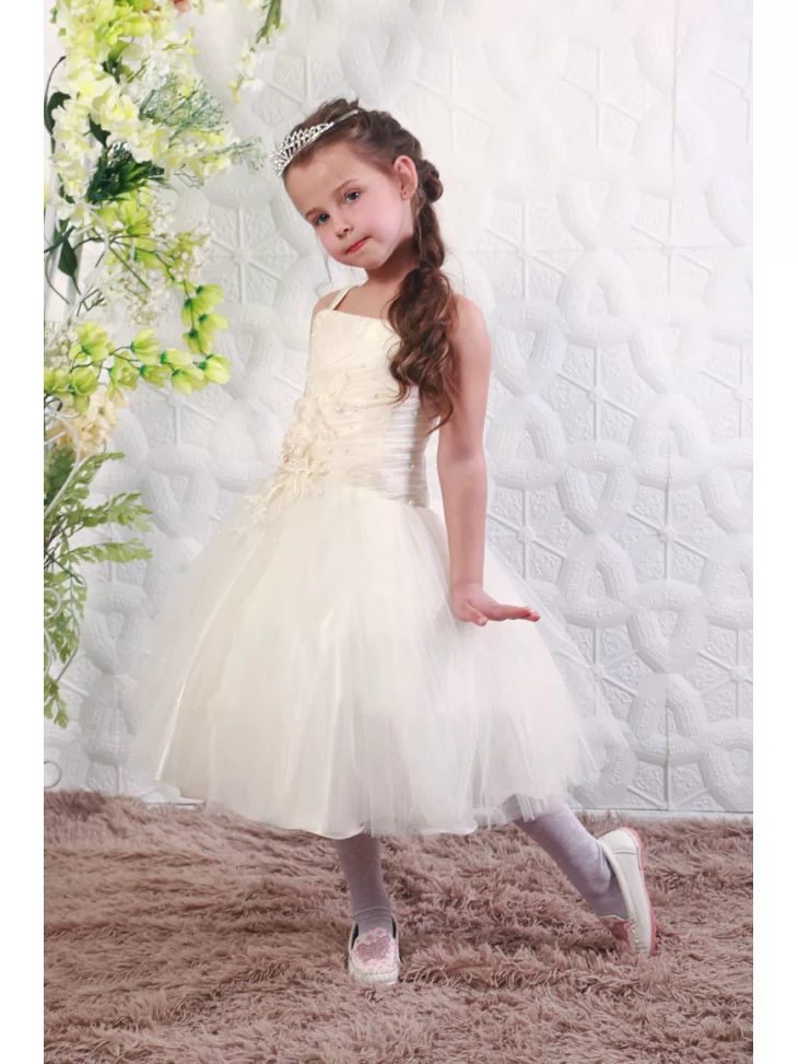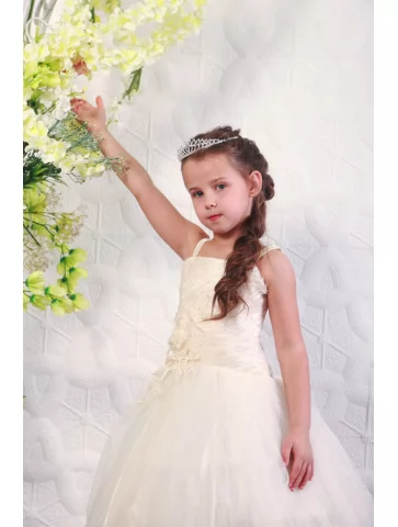 Витончений образ маленької леді, наповнений легкістю, теплом і справжньою казковою елегантністю. М’який кремовий відтінок сукні у поєднанні з пишною фатиновою спідницею створює ніжний силует, який виглядає святково та дуже фотогенічно. Декорований ліф додає образу благородного шарму й робить його ідеальним для урочистих подій. Це прекрасний варіант для оренди карнавальних костюмів на свята, фотосесії та дитячі виступи.