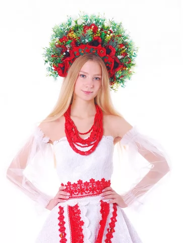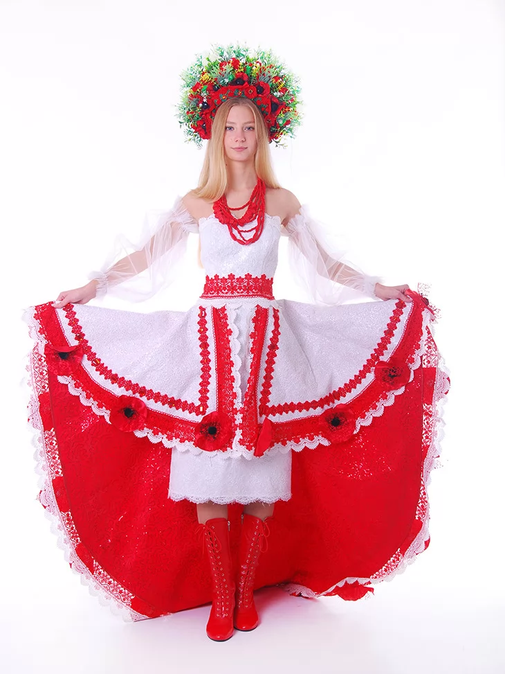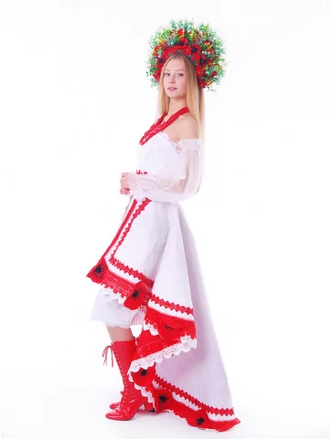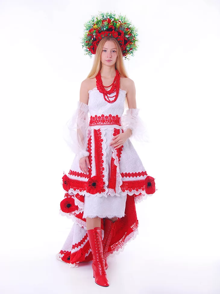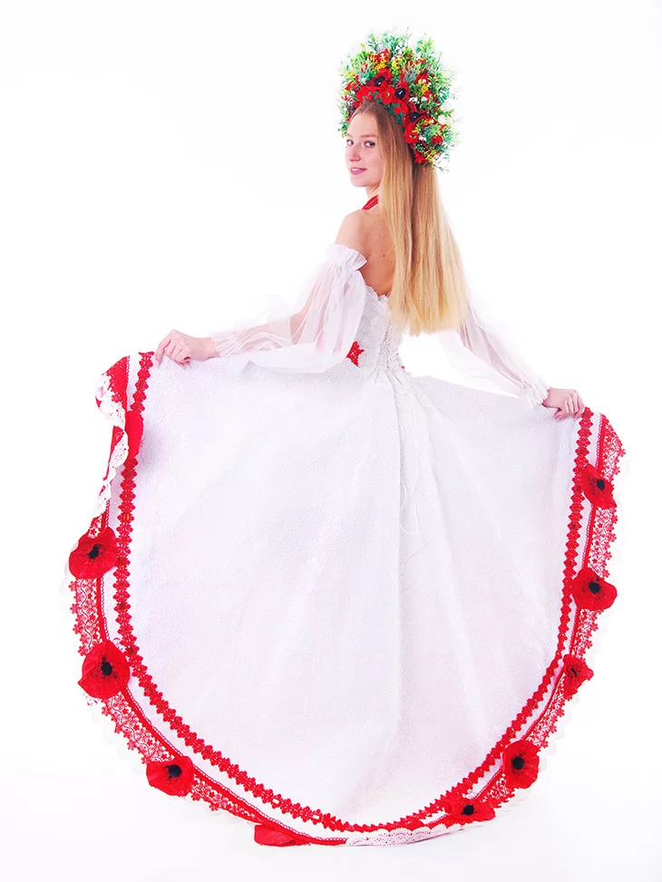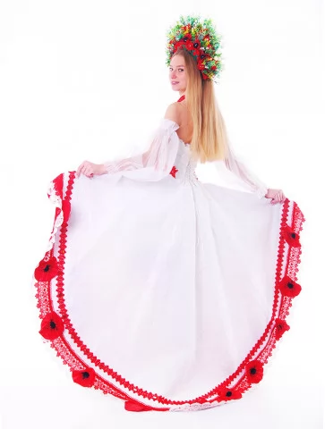 Цей образ — як поєднання народної сили та сценічної естетики. Легка біла сукня з яскравими червоними акцентами виглядає святково, сміливо й дуже фотогенічно. Контрастні вишиті елементи, декоративні маки та пишний віночок створюють ефектний сучасний етнообраз з виразним характером. Це ідеальний варіант для оренди карнавальних костюмів, коли потрібен український образ із вау-ефектом — для сцени, фотосесії чи фестивалю.
