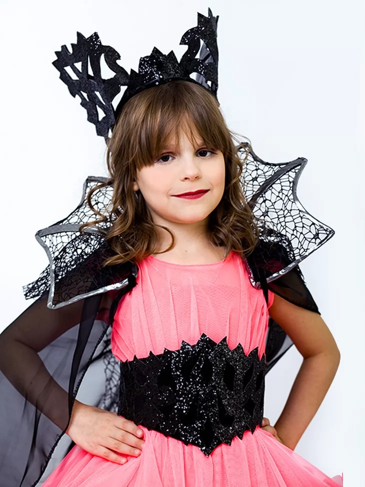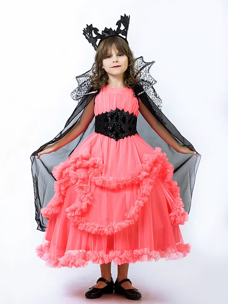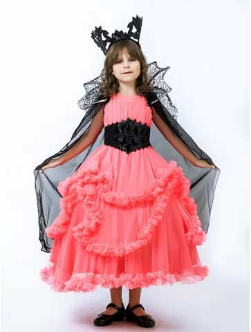 Грайливий, незвичайний і по-справжньому святковий образ для маленької чарівниці. Насичений рожевий відтінок сукні створює ефектний контраст із чорним мереживним поясом та легкою накидкою. Багатошарова фатінова спідниця з декоративними рюшами додає об’єму та казковості, а витончена чорна корона підкреслює магічний характер образу. Чудовий варіант для оренди карнавальних костюмів на Хелловін, дитячі свята та тематичні фотосесії.