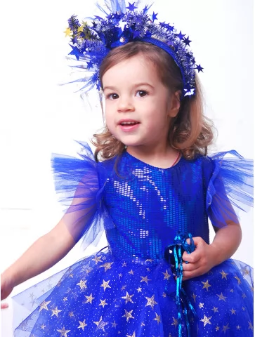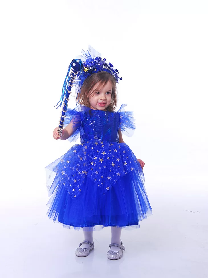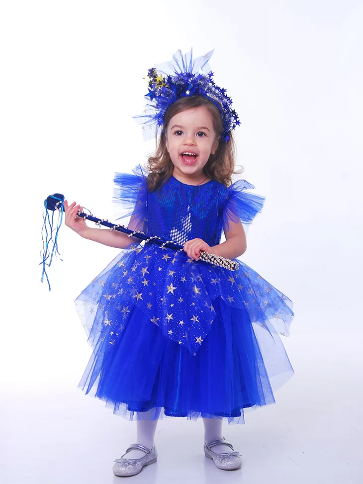 Яскравий, глибокий та чарівний образ, що нагадує казкову ніч, усіяну мерехтливими зірками. Насичений синій колір сукні виглядає виразно й святково. Пишна фатінова спідниця з золотими зірками створює ефект справжнього нічного неба, а блискучий верх додає сценічного сяйва. Обідок зі зірками та чарівна паличка гармонійно завершують образ маленької володарки ночі. Ідеальний варіант для оренди карнавальних костюмів на новорічні ранки, вистави та фотосесії.