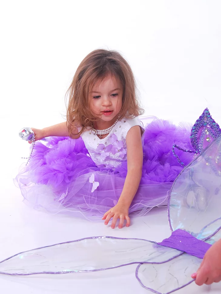 Сукня фіолетова з пишною фатиновою спідницею та метеликами стане яскравою родзинкою образу у прокаті карнавальних костюмів та подарує дитині справжнє відчуття свята.