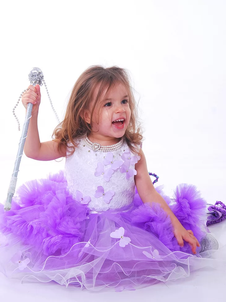 Яскравий казковий образ для маленької принцеси, що виглядає легко, святково й дуже фотогенічно. Білий ажурний ліф ніжно поєднується з розкішною фіолетовою спідницею з багатошарового фатину, прикрашеною об’ємними декоративними елементами у формі метеликів. Сукня створює ефект справжнього чарівного свята й чудово підходить для оренди карнавальних костюмів на дні народження, фотосесії, ранки та урочисті події.