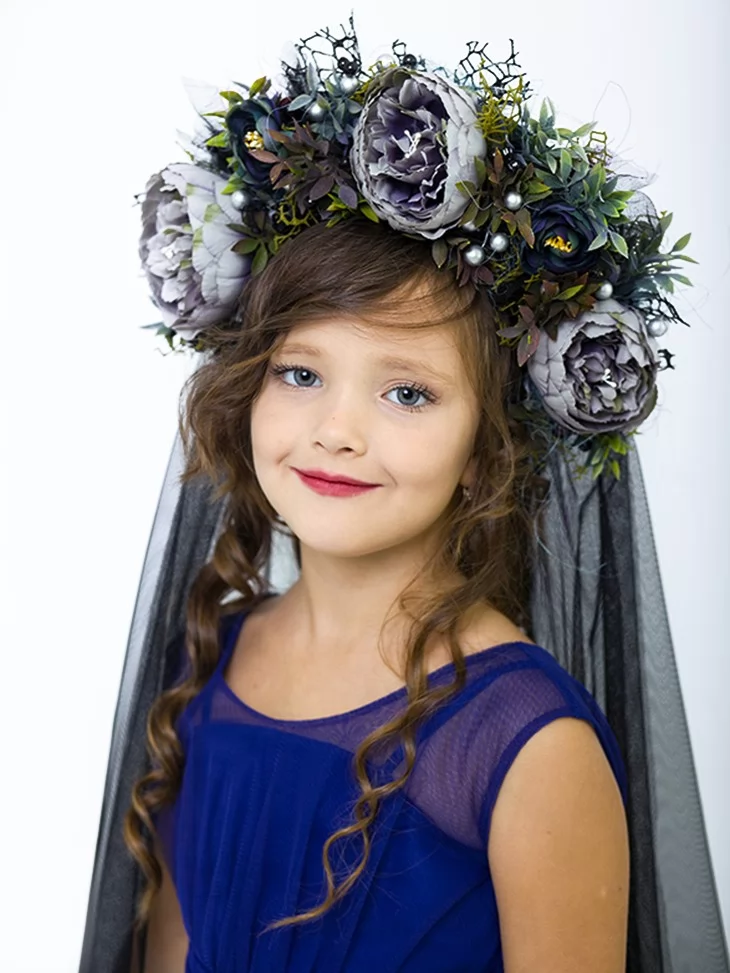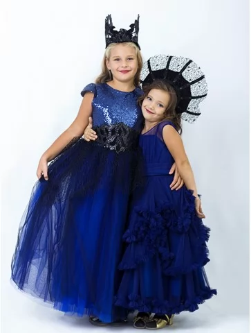 Ніжний і водночас загадковий образ для чарівної хелловінської ночі. Глибокий синій відтінок сукні створює атмосферу таємничості, а багатошарова фатінова спідниця додає легкості й об’єму. Лаконічний верх із прозорими вставками виглядає витончено та святково. Вінок із темними квітами та довга чорна фата завершують перевтілення у маленьку наречену нічної казки. Чудовий вибір для оренди карнавальних костюмів на Хелловін, фотосесії та тематичні свята.