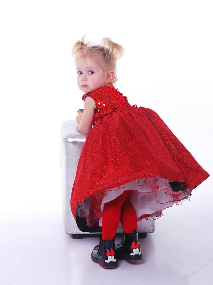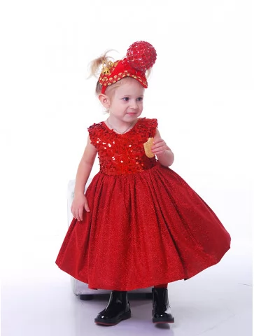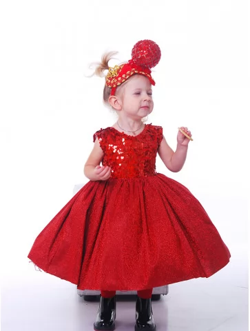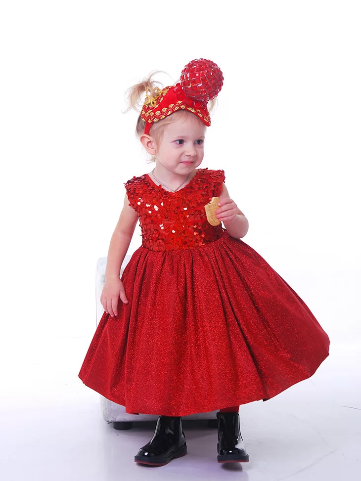 Яскравий, мов новорічна зірочка, образ для перших святкових моментів життя. Блискучий ліф з паєтками красиво переливається на світлі, а пишна спідниця створює казковий силует, у якому кожна дитина відчуває себе справжньою принцесою. Ця сукня чудово підходить для оренди карнавальних костюмів на свята, фотосесії та сімейні урочистості.