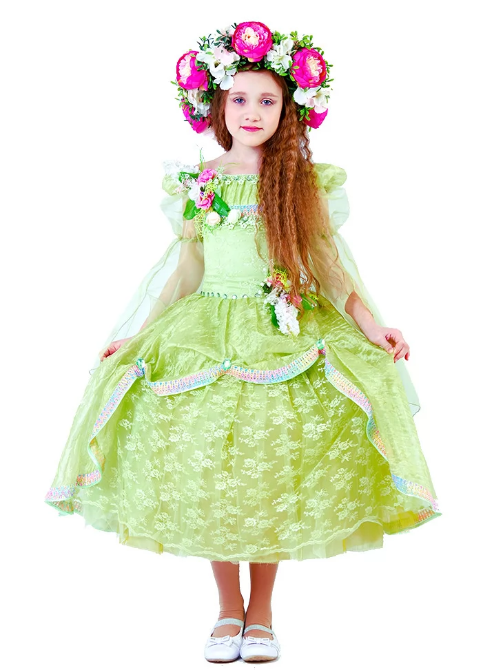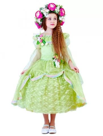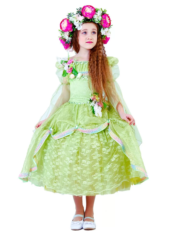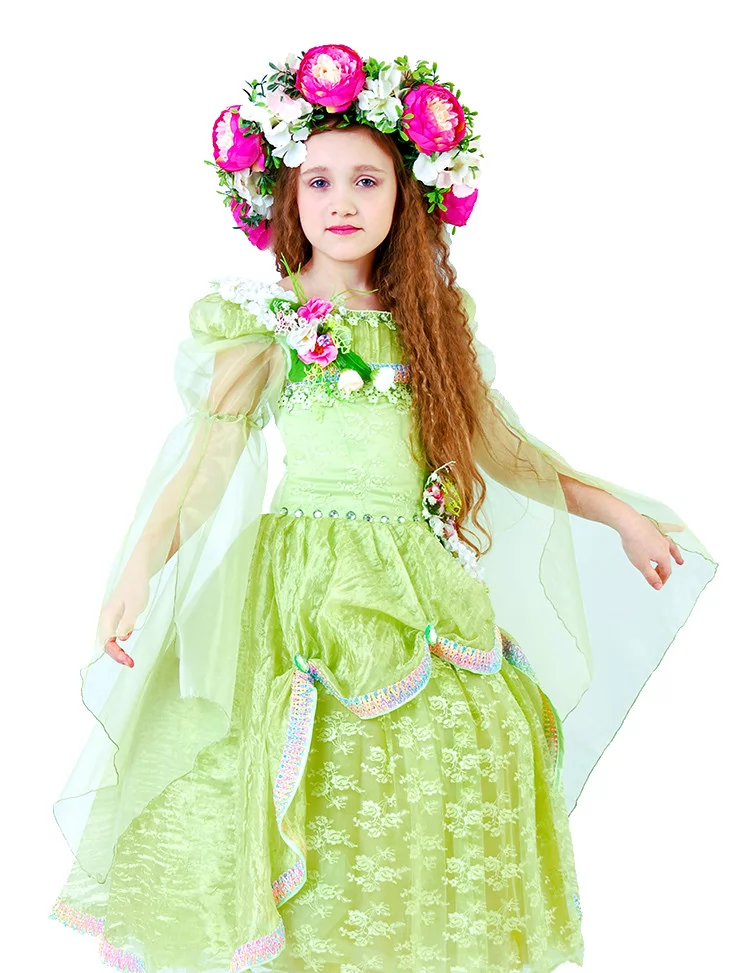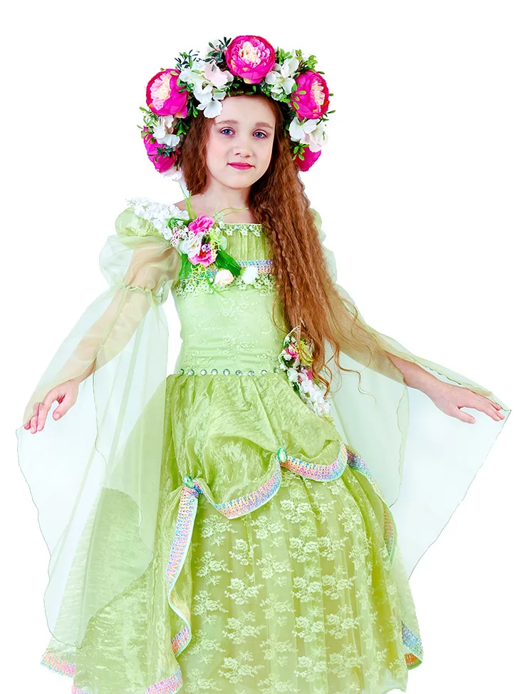Ніжний образ весни, наповнений ароматом квітів, світлом і справжньою казковою легкістю. Цей витончений костюм передає красу природи у момент її розквіту — світло-зелена сукня з мереживними шарами виглядає повітряною, мов пелюстки у весняному вітрі, а розкішний квітковий вінок додає образу святковості й чарівності. Це ідеальний варіант для оренди карнавальних костюмів на ранки, виступи та фотосесії у стилі пори року.