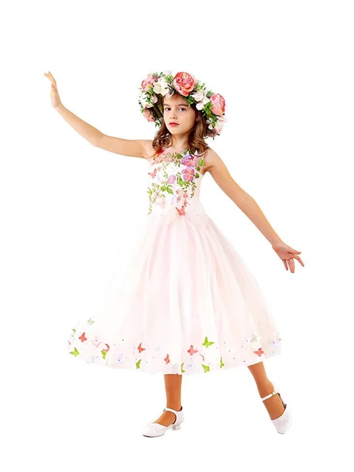 Романтичний та світлий образ весни, наповнений ніжними пелюстками, легкістю фатіну й атмосферою справжнього квіткового пробудження. Цей костюм виглядає витончено та дуже святково — немов жива весняна галявина. Пудрово-рожева сукня з квітковими візерунками та декоративними метеликами створює м’який, казковий силует. Пишний вінок із великих квітів додає образу виразності та урочистості. Це чудовий вибір для оренди карнавальних костюмів на весняні свята, концерти та тематичні фотосесії.