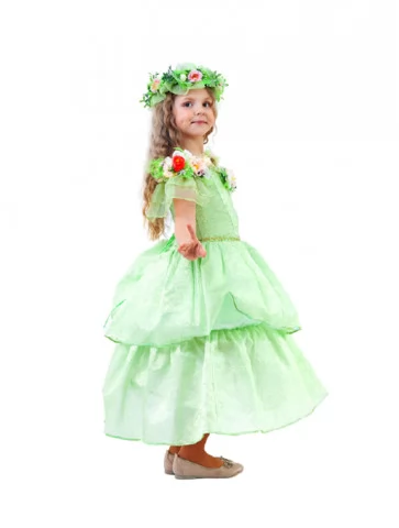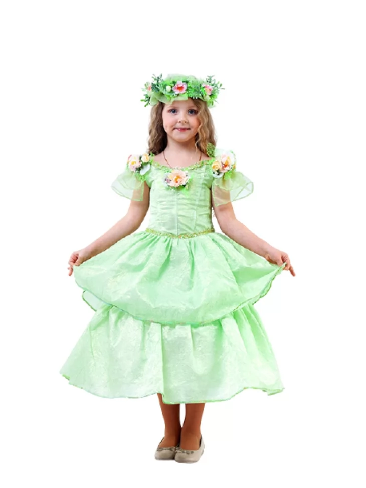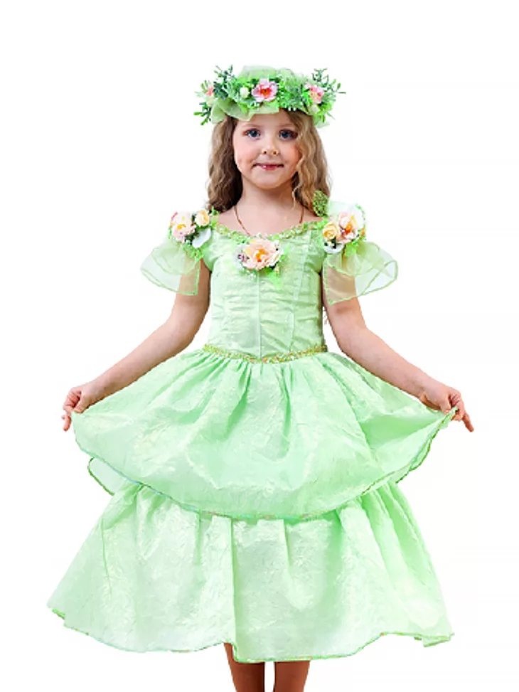 Легкий, світлий і по-справжньому чарівний образ, що передає свіжість молодої зелені та атмосферу квітучого саду. Ніжна світло-зелена сукня з пишною багатоярусною спідницею створює повітряний силует, а квітковий декор на плечах і витончений віночок додають образу гармонії та святковості. Ідеальний варіант для оренди карнавальних костюмів на весняні ранки, вистави та фотосесії.