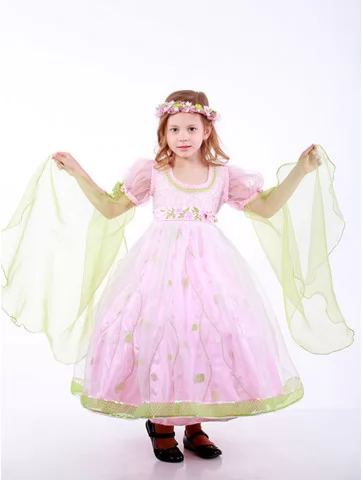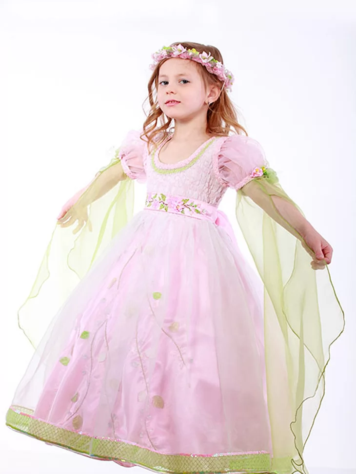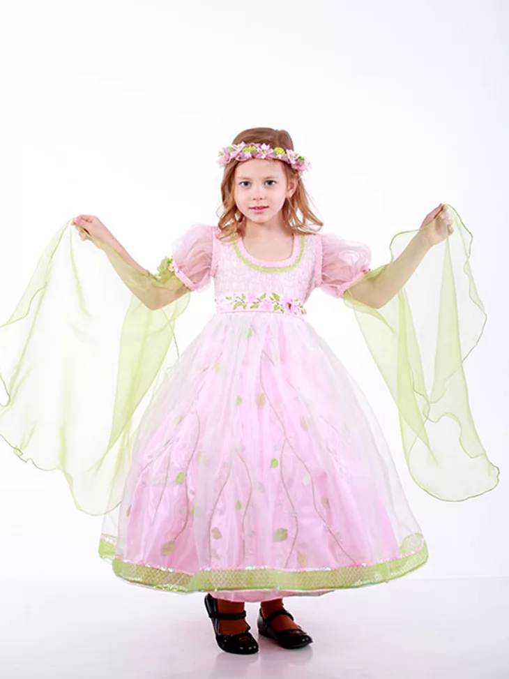 Ніжний, світлий і надзвичайно романтичний образ весни, що нагадує про перші квітучі дерева та теплі сонячні дні. Повітряна рожева сукня з легкою прозорою спідницею створює витончений силует, а зелені накидки-рукави додають образу легкості й казкової граційності. Делікатний квітковий віночок гармонійно завершує весняний настрій. Ідеальний вибір для оренди карнавальних костюмів на ранки, вистави та фотосесії.