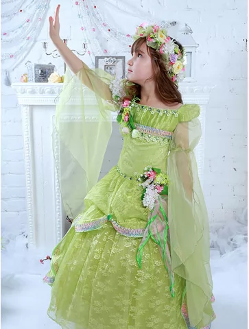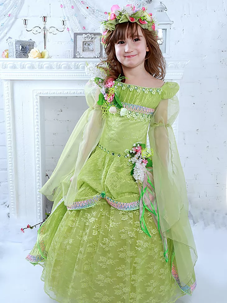 Ніжний казковий образ весни, сповнений свіжості квітучих садів, м’якого сонячного світла та чарівної легкості природи. Світло-зелена сукня з витонченим мереживом, прозорими рукавами та пишною спідницею створює справжній образ юної весняної володарки, а квіткові композиції на корсеті та вінок з пелюсток додають святкової гармонії. Це чудовий вибір для оренди карнавальних костюмів на весняні ранки, тематичні вистави та фотосесії.