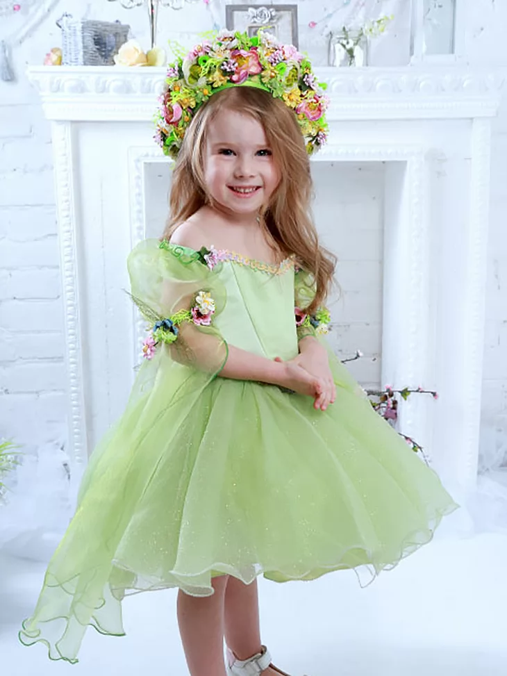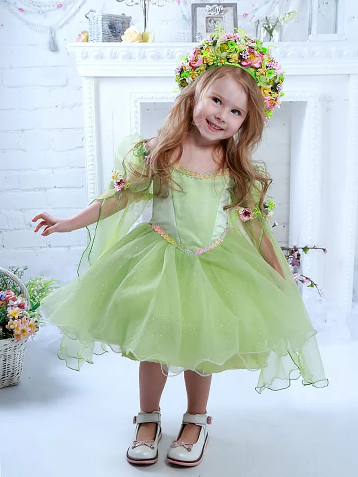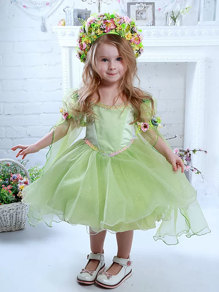 Ніжний образ маленької весняної феї огортає легкістю, свіжістю та чарівною атмосферою перших квітів.Повітряна світло-зелена сукня з блиском і м’якими фатіновими шарами створює легкий силует, що красиво рухається під час танцю чи прогулянки сценою. Декоративні квіткові акценти на рукавах та витончений вінок із яскравих весняних квітів роблять образ гармонійним і святковим. Чудовий вибір для оренди карнавальних костюмів на весняні ранки, фотосесії та тематичні вистави.
