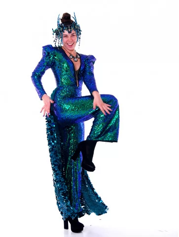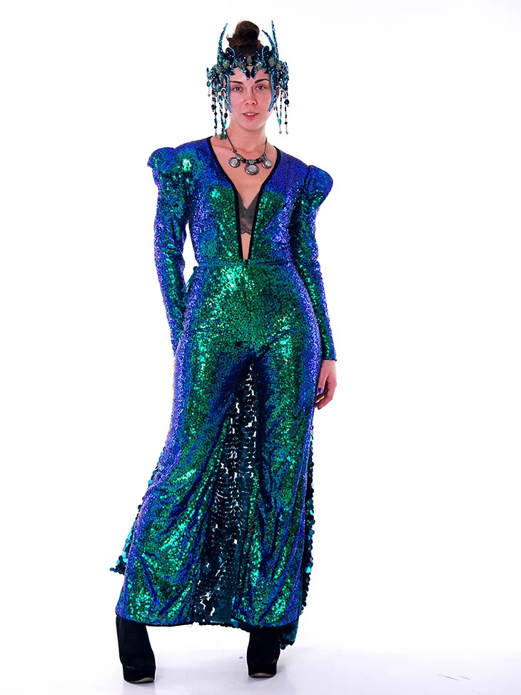 Костюм «Бірюзова Сирена» — це справжня гіпнотична феєрія блиску, глибини кольору та містичного чарівництва. Вишуканий комбінезон, усипаний пайєтками у відтінках бірюзи та смарагду, підкреслює кожен рух, немов хвиля, що грає з місячним світлом. Довгий шлейф з великих блискучих лусочок створює ефект морського серпанку, а складна діадема у стилі глибоководної королеви додає образу театральності та сили. Цей костюм ідеально втілює дух Burning Man — дикий, блискучий, трансцендентний. Оренда карнавальних костюмів у стилі «Бірюзова Сирена» — це запрошення в інший вимір.