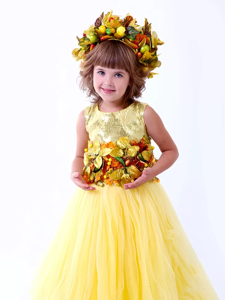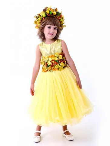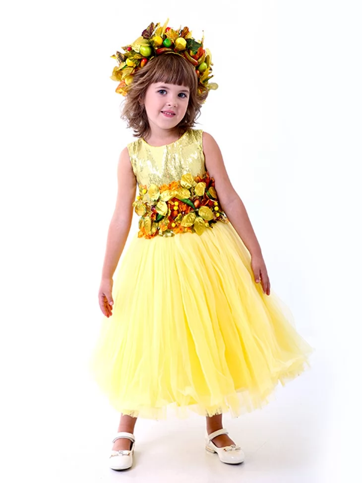 Світлий, теплий образ, що втілює сонячний настрій врожайної пори та казкову красу осінніх днів. Ніжно-жовта сукня з пишною фатіновою спідницею виглядає легко й святково, а декоративний пояс і вінок із листя та плодів створюють ефект справжньої осінньої королеви природи. Це чудовий варіант для оренди карнавальних костюмів на свята Осені, тематичні заходи та фотосесії.