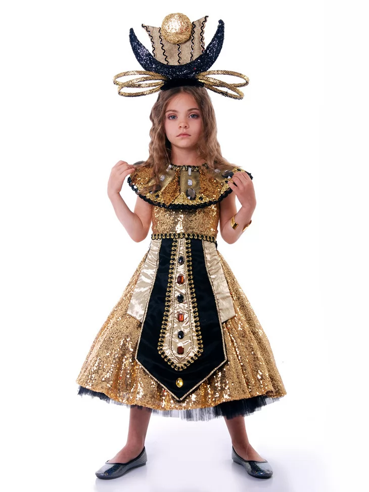 Костюм Єгипетської Цариці Сонячного Диска створює сильний і благородний образ, у якому кожна дитина почуватиметься справжньою правителькою давньої цивілізації. Костюм чудово підходить і для прокат карнавальних костюмів на тематичні заходи, фотосесії та шкільні виступи.