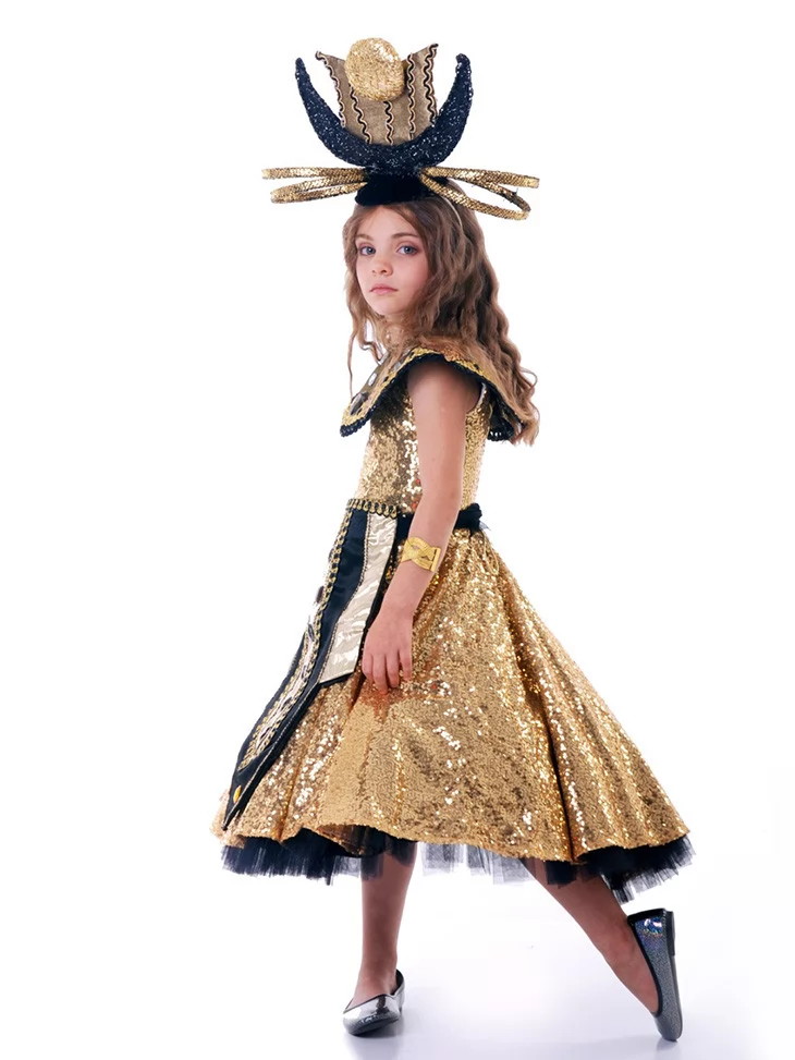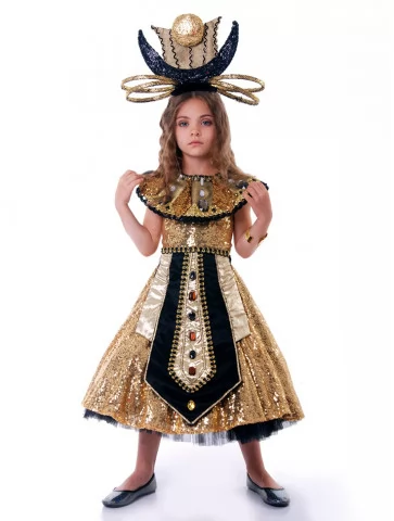 Величний образ, натхненний міфами Давнього Єгипту, де кожна деталь символізує владу, світло та божественне походження. Поєднання чорного й золотого кольорів створює сильний, урочистий силует, який одразу асоціюється з фараонами та царицями Нілу. Це ефектний варіант для оренда карнавальних костюмів, коли потрібен яскравий і статусний образ.