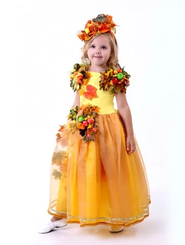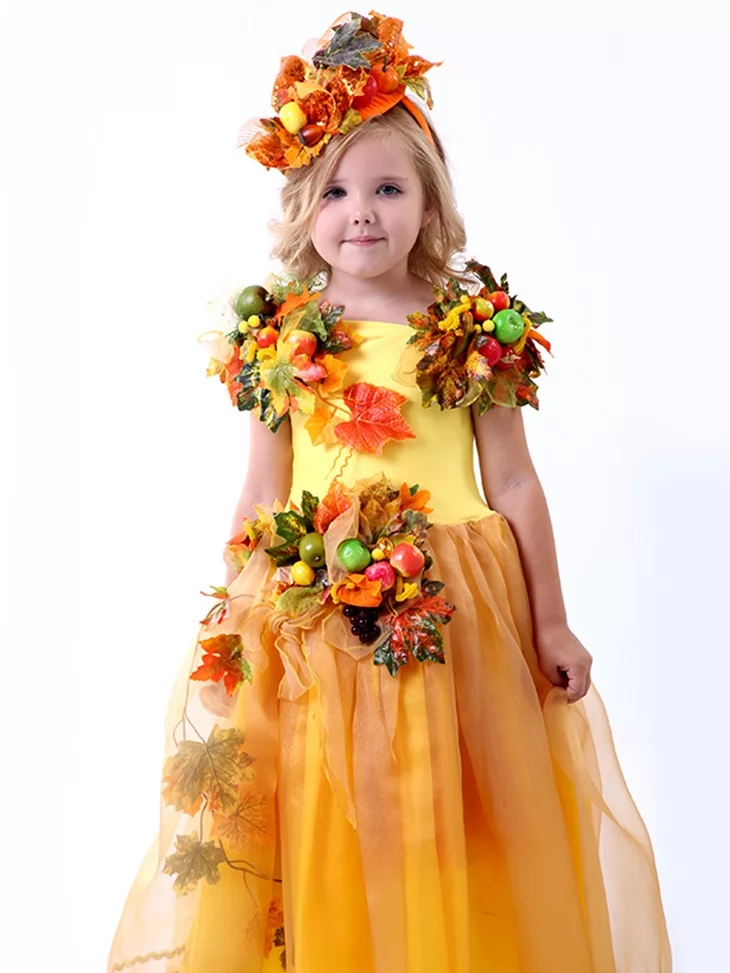 Ніжний, теплий образ справжньої володарки золотої пори року, наповнений барвами стиглих плодів і чарівного листя. Сонячно-жовта сукня з легкою напівпрозорою спідницею красиво струменіє в русі, а пишні декоративні композиції з ягід, фруктів і осіннього листя на плечах, талії та у вінку створюють святкову казкову атмосферу. Це чудовий вибір для оренди карнавальних костюмів на осінні ранки, тематичні заходи та фотосесії.