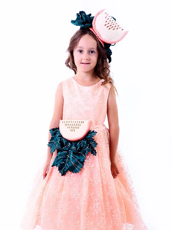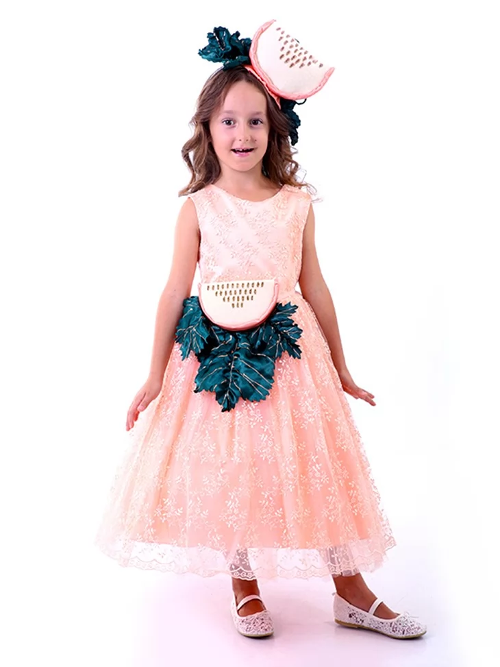 Легкий, витончений і по-справжньому казковий образ, що ніби створений з літнього сонця та фруктової свіжості. Ніжно-персикова сукня з мереживною фактурою у поєднанні з декоративними листочками та соковитою динею створює дуже м’який, святковий силует. Цей чарівний образ ідеально підходить для оренди карнавальних костюмів на дитячі ранки, фотосесії та тематичні свята. Повітряна спідниця красиво рухається під час ходи, а фруктові акценти додають костюму оригінальності та казкового настрою.