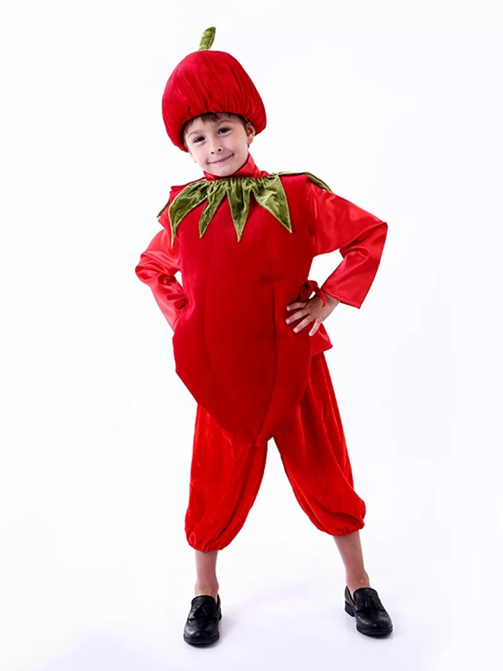 Цей веселий і дуже виразний образ створює атмосферу свята та одразу привертає увагу насиченим червоним кольором. Об’ємна форма, червона манішка з коміром у вигляді листочків і кумедна шапка формують впізнаваний персонаж перцю. Чудовий вибір для оренди карнавальних костюмів на дитячі ранки, свята осені та тематичні заходи.