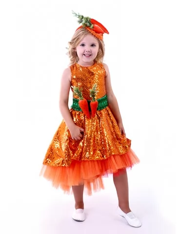 Яскравий овочевий образ, що випромінює радість, тепло та справжню святкову атмосферу. Блискуча помаранчева сукня з пишною фатіновою спідницею створює ефектний силует, а декоративні морквинки на поясі та головному уборі додають образу казковості й оригінальності. Це чудовий варіант для оренди карнавальних костюмів на осінні свята, тематичні ранки та фотосесії.