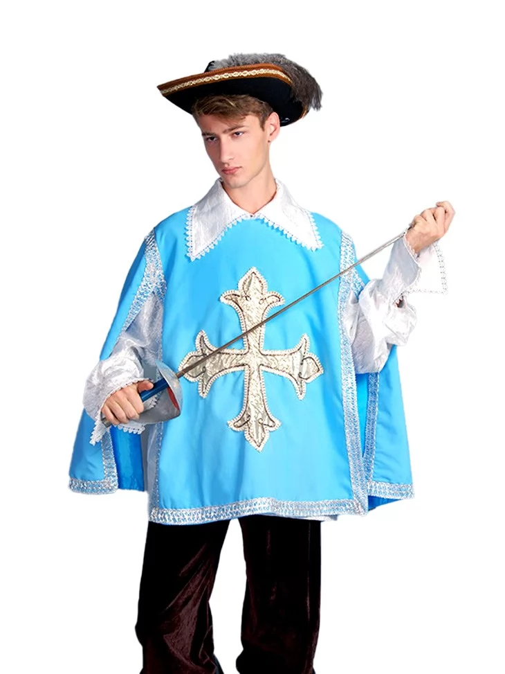 Цей карнавальний костюм Мушкетера – ідеальне втілення епохи благородства, відваги та лицарської честі. Образ чудово підійде для тематичних балів, історичних реконструкцій, театральних виступів і фотосесій. Яскравий синій плащ з гербом, об’ємні штани та капелюх із пір’ям переносять у світ мушкетерських пригод.