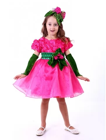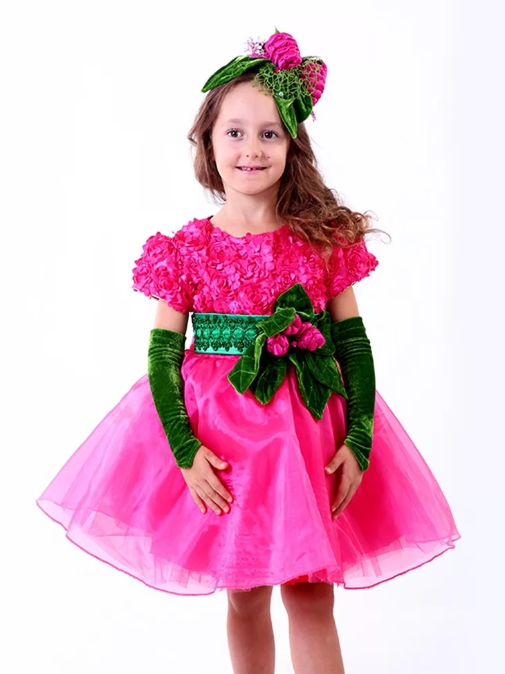Яскравий, соковитий і по-дитячому чарівний образ, який одразу створює святковий настрій та привертає увагу. Насичений рожевий колір сукні у поєднанні з зеленими акцентами листя та декоративними ягідками виглядає дуже ефектно й казково. Пишна фатінова спідниця красиво розкривається в русі, а квітково-фруктові елементи на поясі та головному уборі формують завершений образ. Це чудовий варіант для оренди карнавальних костюмів на ранки, свята врожаю та тематичні події, коли хочеться подарувати дитині справжню казку.