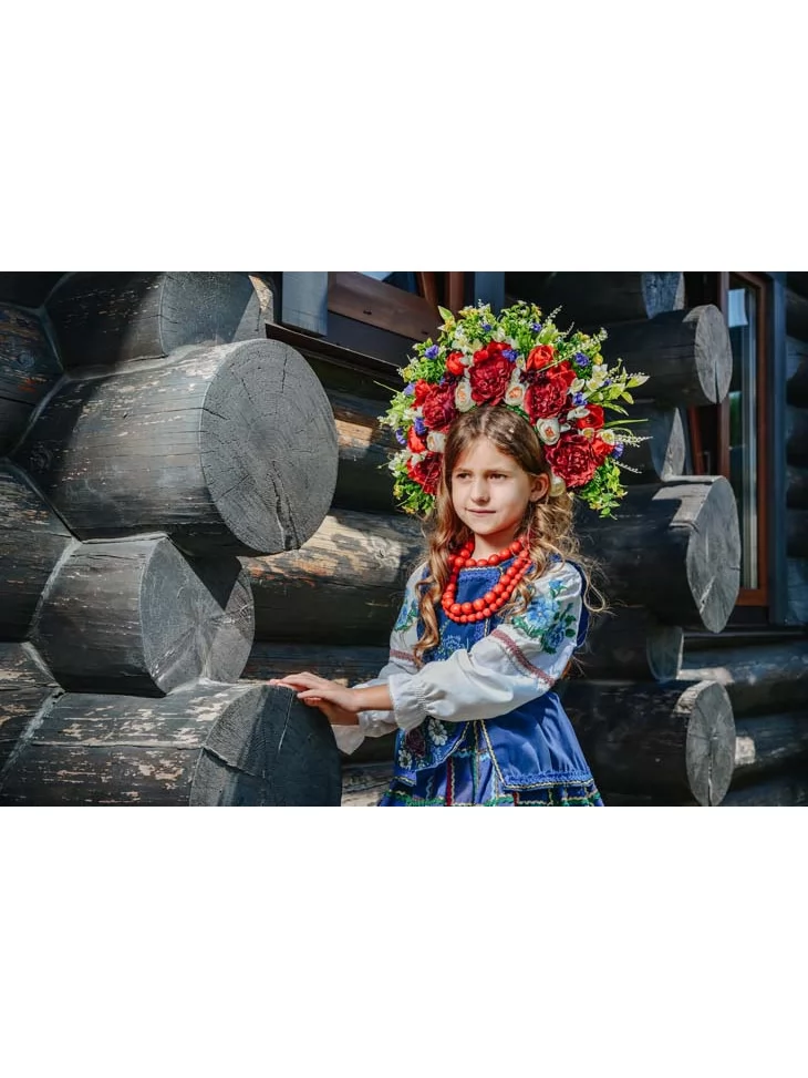 Український народний костюм у синьо-червоній гамі з квітковим вінком