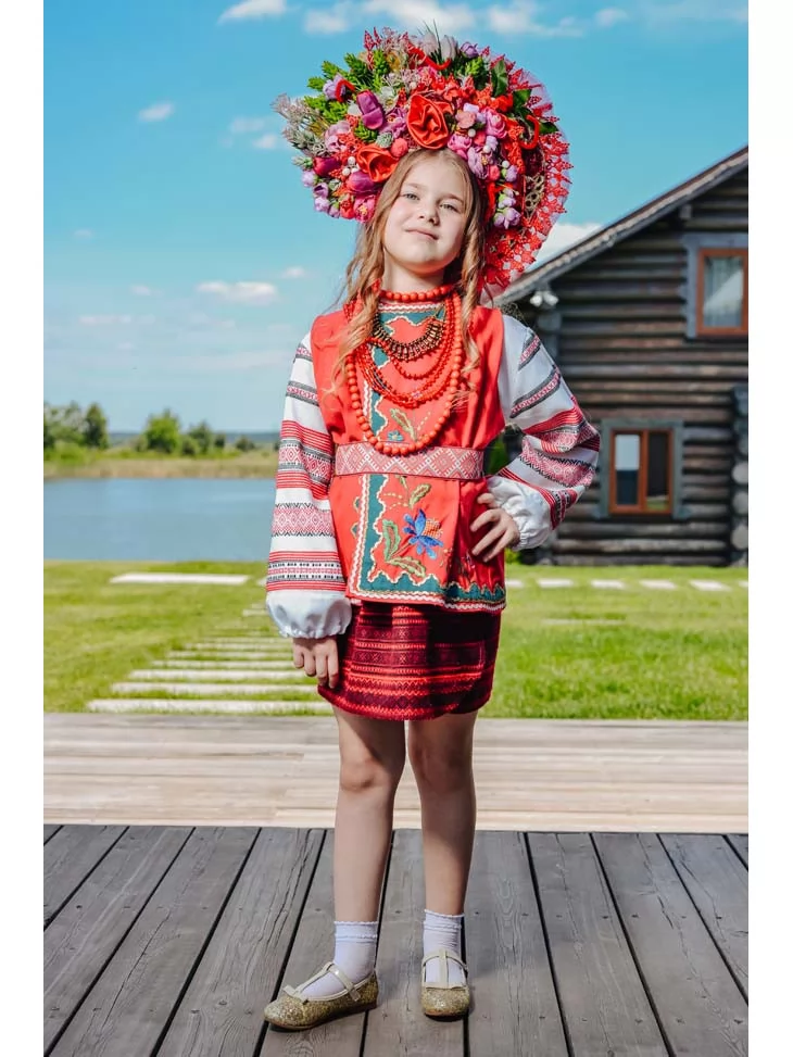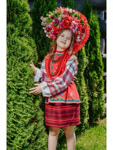 Цей яскравий традиційний образ випромінює святковий настрій і справжній український колорит. Насичена червона керсетка, орнаментальна спідниця та розкішний вінок з квітів і стрічок створюють ефектний силует, який одразу привертає увагу. Костюм ідеально підходить для оренди карнавальних костюмів на національні свята, виступи й фотосесії.