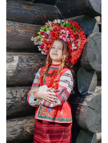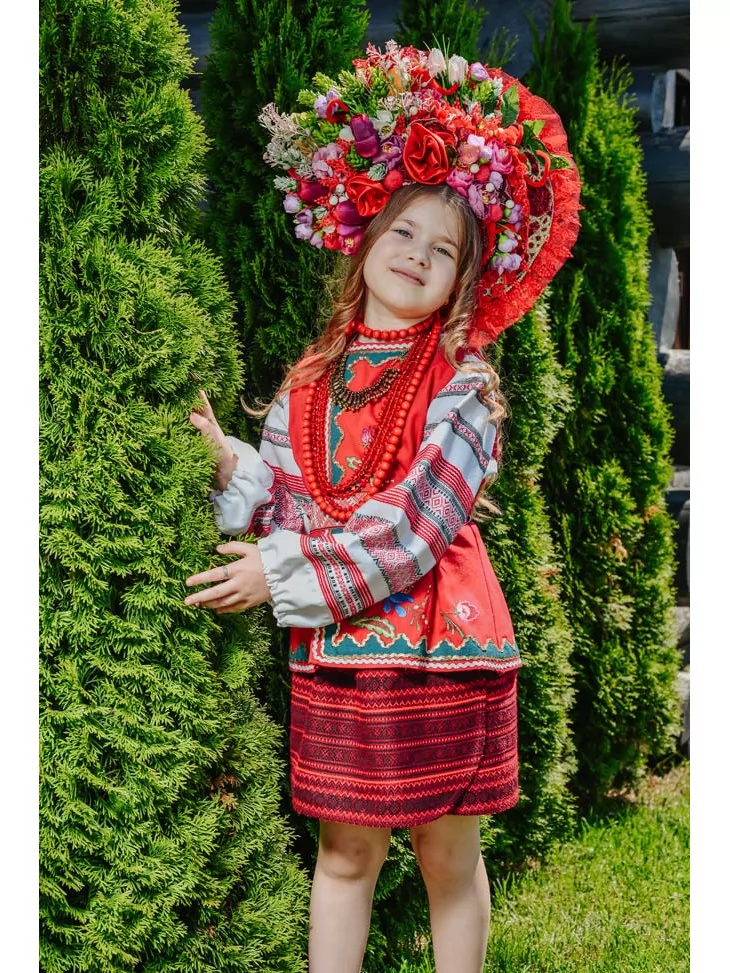 Український народний костюм з червоною керсеткою та пишним квітковим вінком