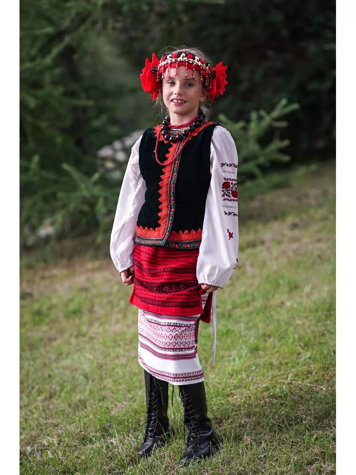 Цей виразний народний образ поєднує класичні елементи українського строю з яскравими етнічними акцентами. Контраст червоного, чорного та білого кольорів формує впізнаваний силует, наповнений характером і традиційною символікою. Костюм ідеально підходить для оренди карнавальних костюмів на шкільні свята, виступи, фестивалі та тематичні фотосесії.