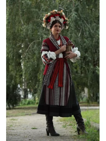 Цей образ — глибокий, містичний і дуже сильний. Він поєднує традиційний український народний костюм із фольклорним, майже обрядовим настроєм. Темні відтінки, геометрична вишивка, масивний квітковий вінок і символічний череп створюють драматичний, атмосферний образ жінки-берегині, знахарки або персонажки з давніх легенд. Це нестандартний вибір для тих, хто шукає оренду карнавальних костюмів із характером і глибоким сенсом.