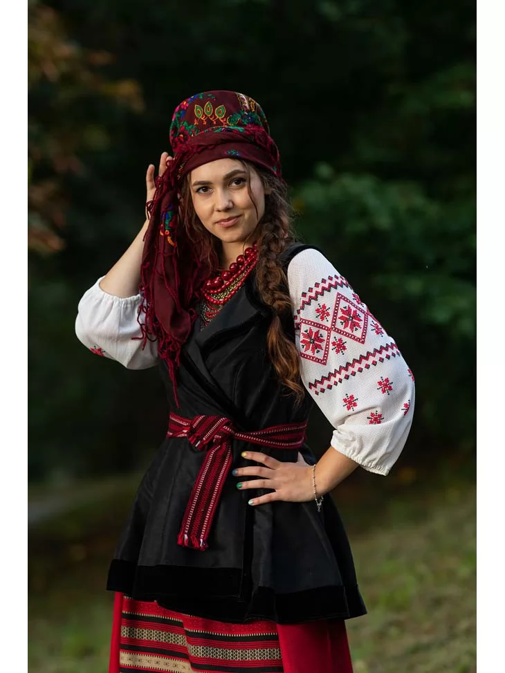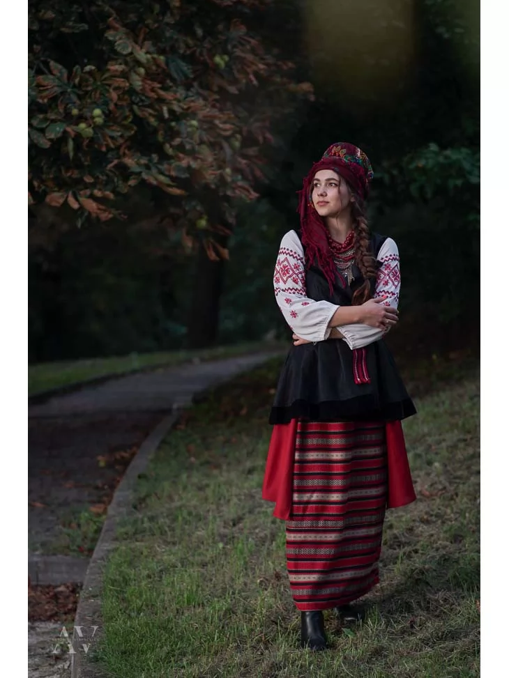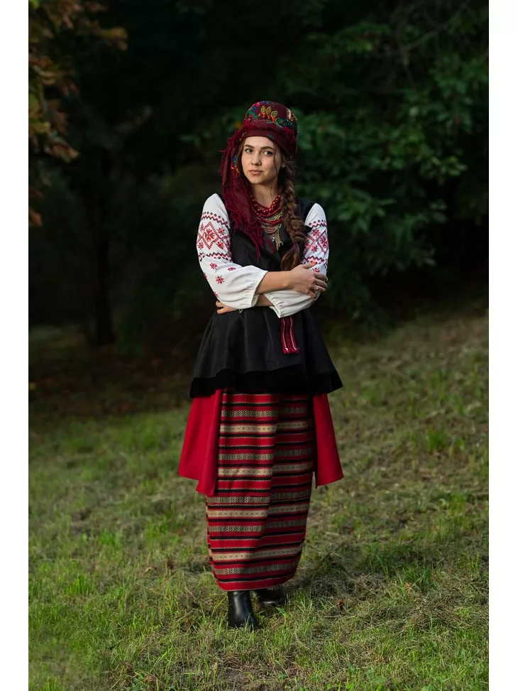 Цей образ передає глибину українських традицій, жіночу стриману красу та зв’язок із рідною землею. Вишиванка з геометричними орнаментами поєднується з керсеткою та плахтою, створюючи впізнаваний силует української дівчини з народних пісень і легенд. Багатошарове намисто та традиційний головний убір додають образу автентичності й характеру. Це гармонійний і дуже атмосферний варіант для оренди карнавальних костюмів, коли важливо передати справжній національний колорит.