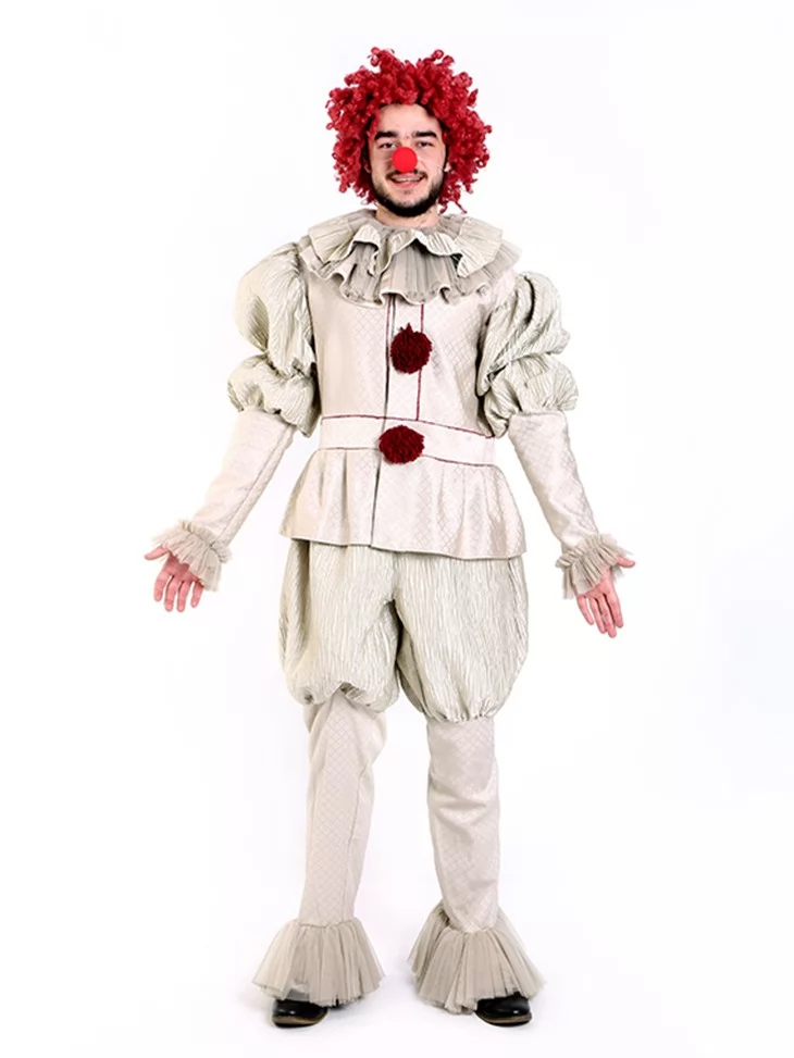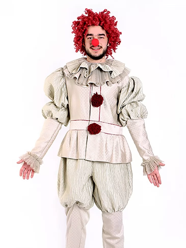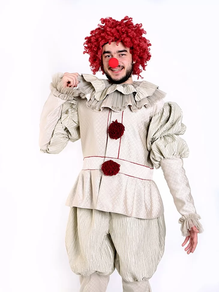 Костюм Клоуна з фільму «Воно» — це ідеальне поєднання страху та видовищності. Його вінтажний дизайн і впізнавані акценти миттєво викликають асоціації з культовим персонажем. Образ чудово підходить як для костюмованих вечірок, так і для театралізованих подій, де хочеться вразити. Пропонується в рамках послуги оренда карнавальних костюмів.