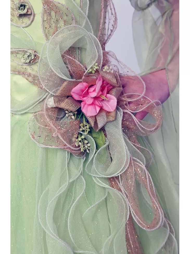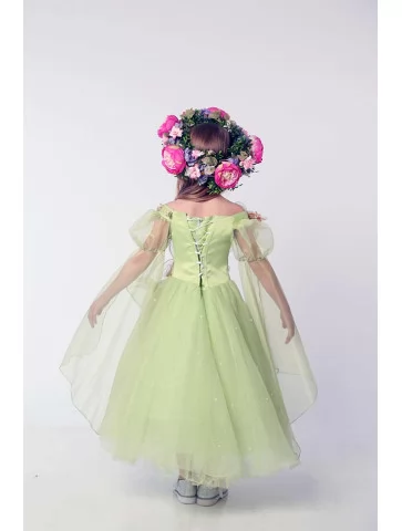 Ніжний весняний образ, сповнений легкості, квіткового тепла та чарівного пробудження природи. Цей витончений костюм передає красу квітучої весни у кожній деталі — м’які зелені відтінки сукні, повітряні прозорі накидки та розкішний квітковий декор створюють казковий силует. Об’ємні квіти на корсажі й вінок у волоссі виглядають урочисто та дуже святково. Це ідеальний варіант для оренди карнавальних костюмів на весняні ранки, виступи та фотосесії, коли хочеться ніжності й магії образу.