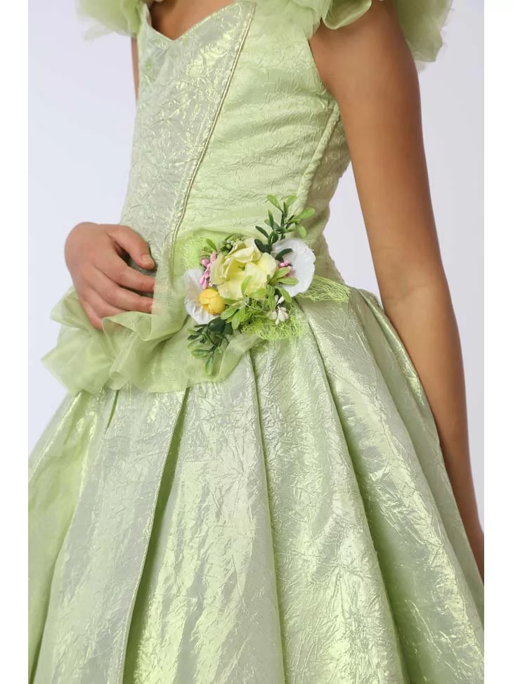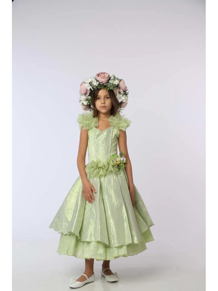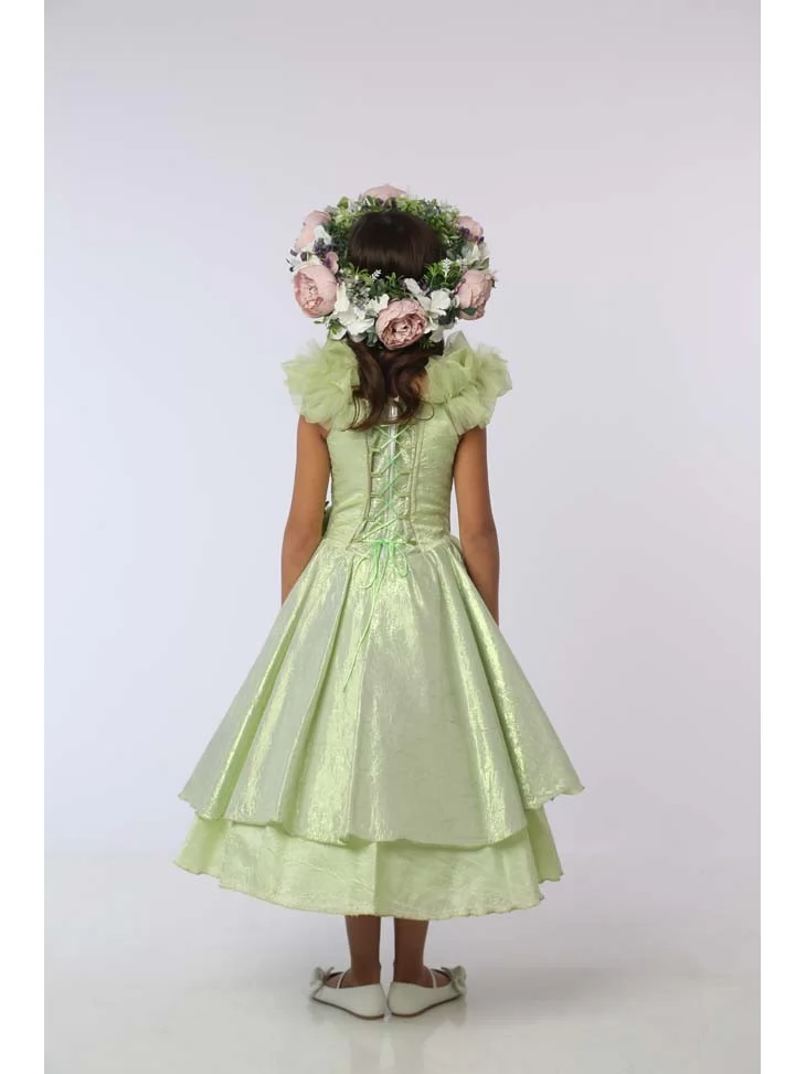 Витончений і світлий образ весни, що уособлює пробудження природи, м’яке тепло сонця та ніжність перших квітів. Світло-зелена сукня з делікатним блиском виглядає по-королівськи урочисто, а пишні багатоярусні спідниці створюють красивий святковий силует. Квітковий віночок із великих пелюсток і ніжні декоративні акценти на талії наповнюють образ природною гармонією. Цей варіант чудово підходить для оренди карнавальних костюмів на весняні ранки, вистави та фотосесії.