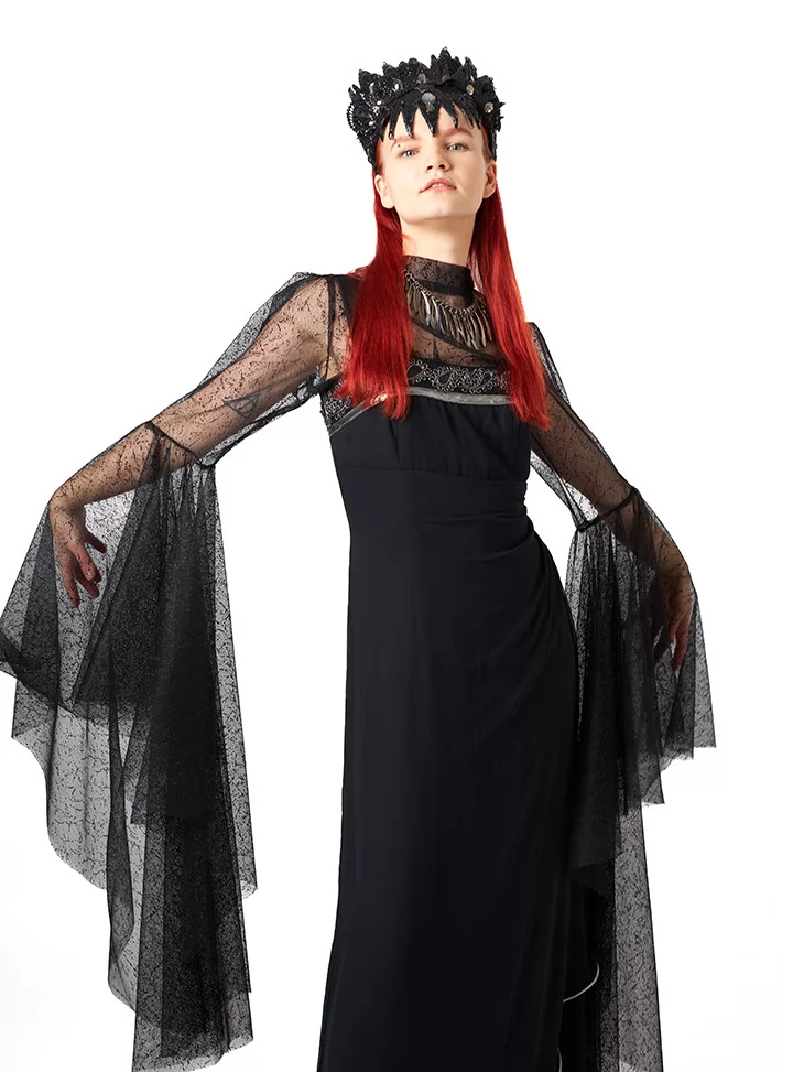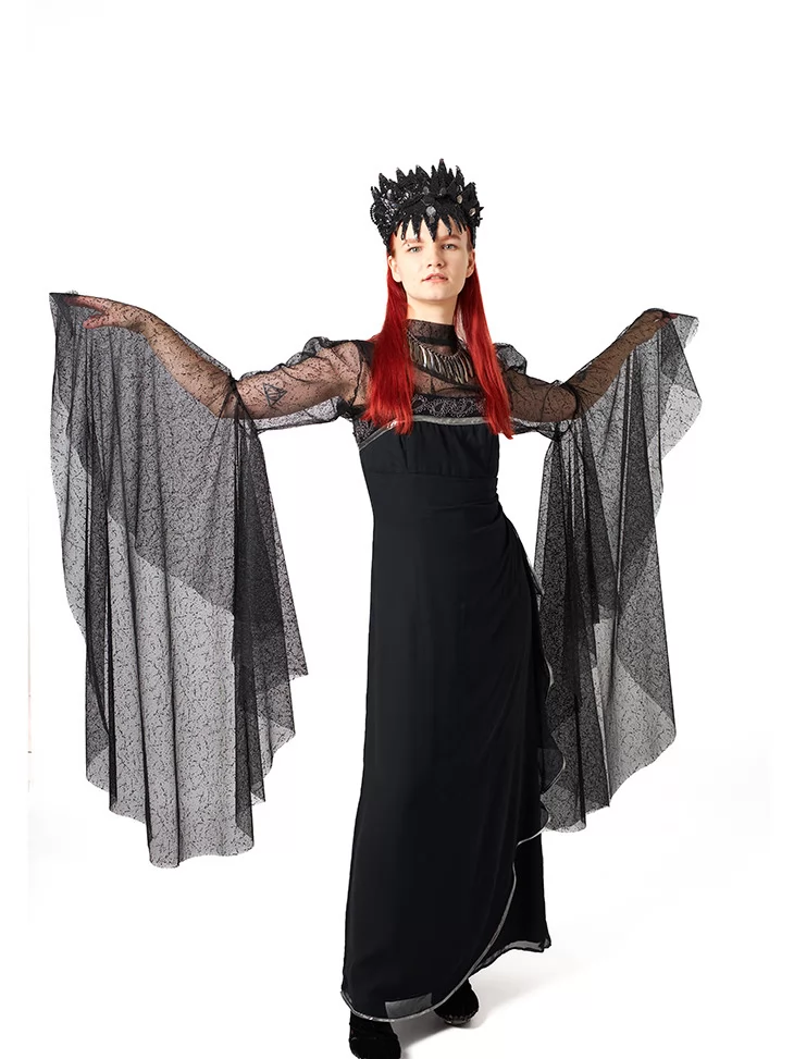 Стримана велич, готична елегантність і справжня сила темної магії в одному образі. Довга чорна сукня створює витончений силует із благородною стриманістю. Напівпрозора мереживна блуза додає легкості та містичного настрою, а ефектна чорна корона підкреслює статус володарки нічного балу. Лаконічний, але дуже виразний образ ідеально підійде для оренди карнавальних костюмів на Хелловін, готичні вечірки та тематичні фотосесії.