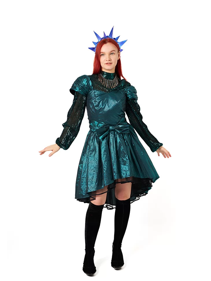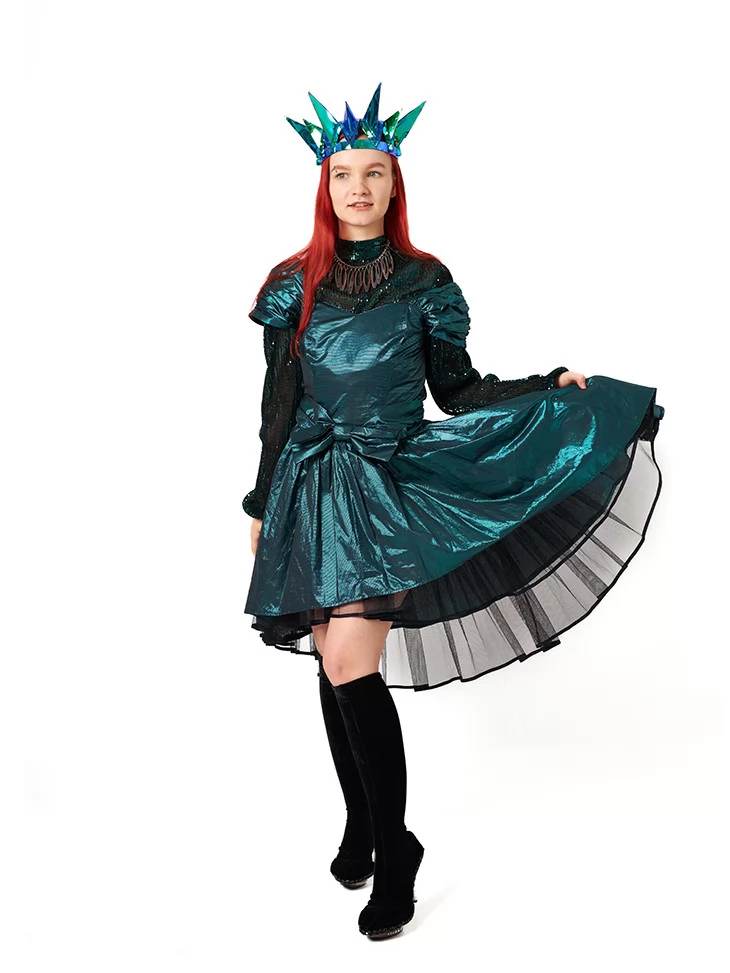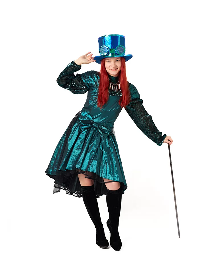 Костюм «Бірюзова Леді» — це ексцентричний та харизматичний образ із естетики стімпанку, в якому театральність, блиск і механічна елегантність поєднуються у справжнє шоу. Глибокий колір металік, класичний циліндр та декоративна тростина створюють вигляд персонажа з фантастичної опери чи майстерні геніального винахідника. Образ доступний через оренду карнавальних костюмів.