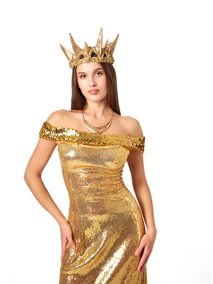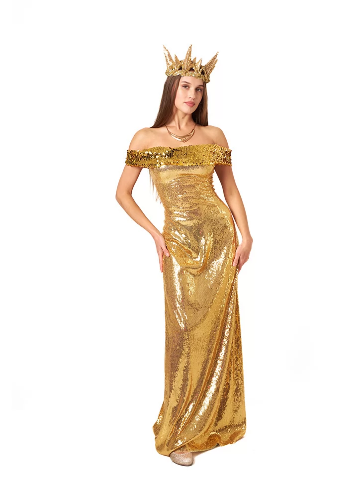 Костюм «Золота Королева» — це вибух золота, блиску та царської елегантності. Довга сукня, вкрита блискітками, ідеально підкреслює фігуру та створює відчуття урочистості. Велична золота корона і стильна прикраса на шию додають завершеності та монархічного шарму. Завдяки сервісу оренда карнавальних костюмів, ви можете стати королевою будь-якого балу або вечірки.