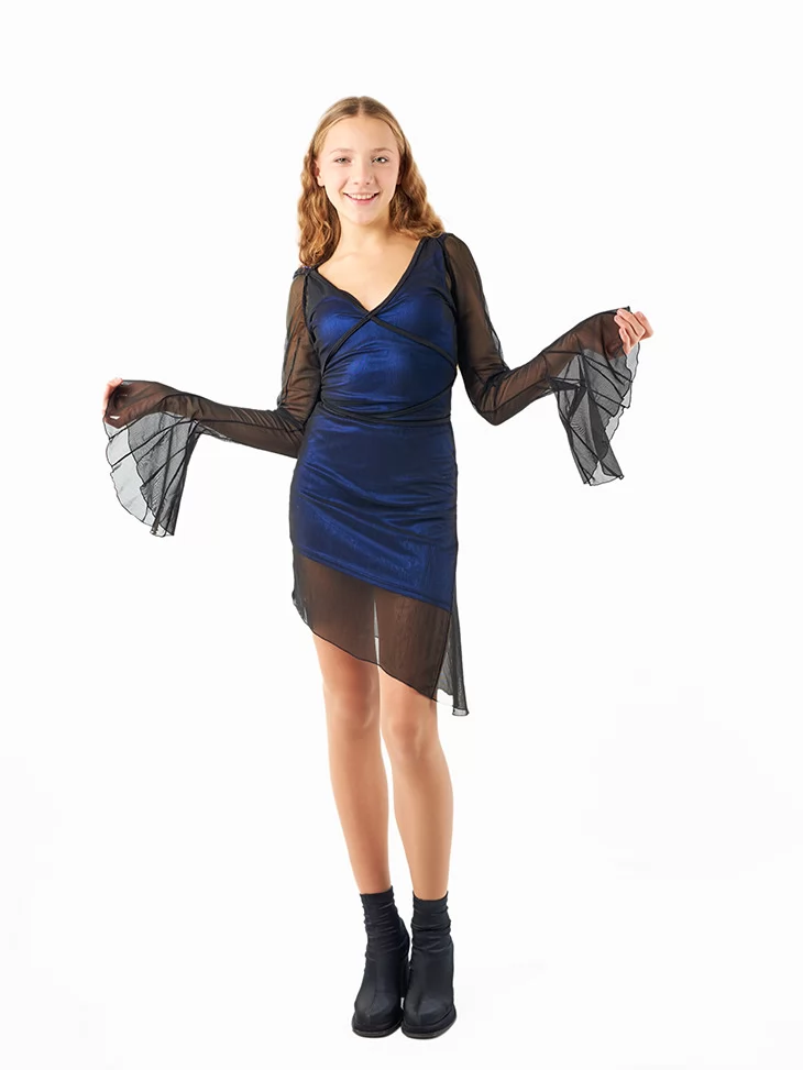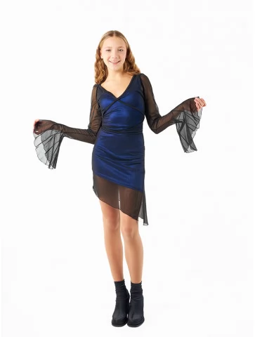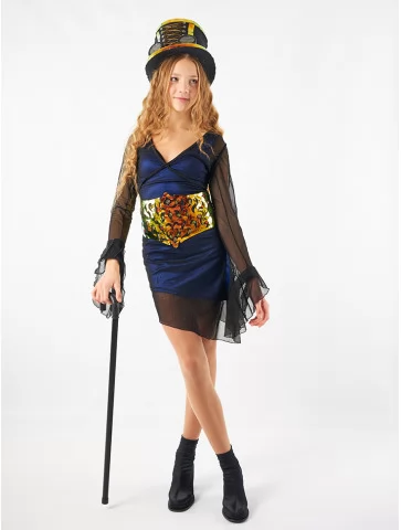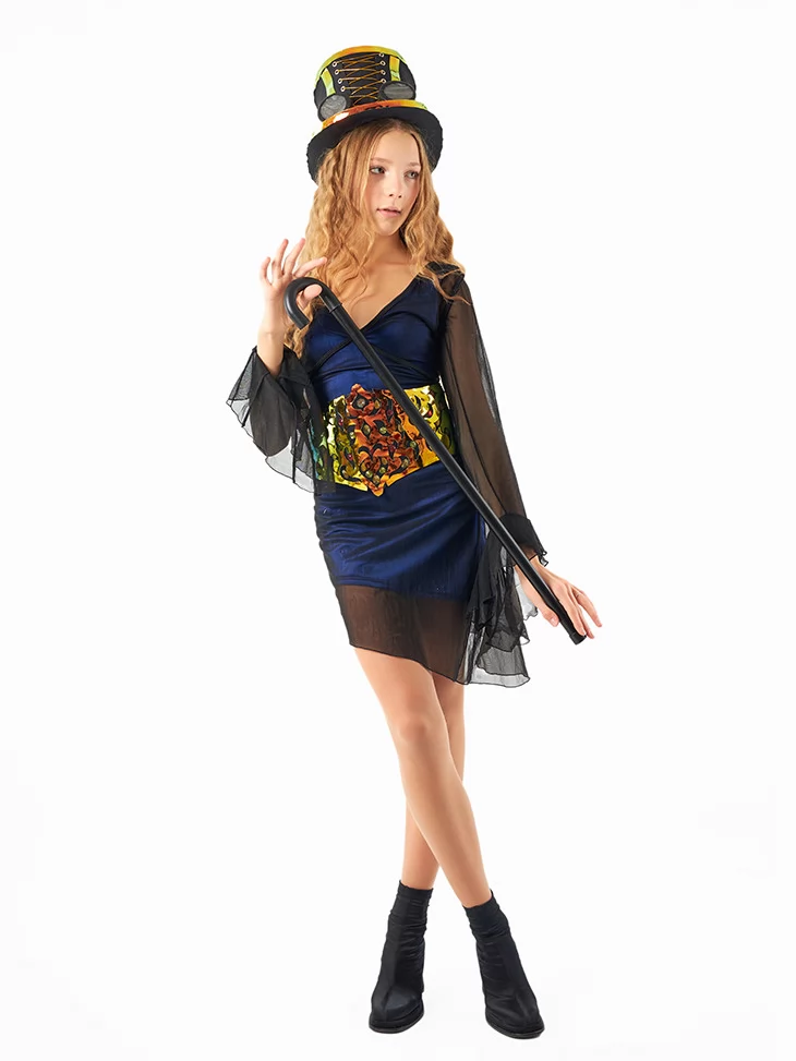 Костюм «Чарівна Хазяйка Ілюзій» — стильне поєднання гламуру та темної магії. Образ складається з короткої оксамитової сукні глибокого синього кольору, прозорої накидки з фатину, масивного ілюзіоністичного поясу з голографічними елементами та високого капелюха у стилі стимпанк. Такий костюм чудово підійде для яскравої вечірки або містичної фотосесії. Оренда карнавальних костюмів дозволяє легко приміряти роль загадкової чаклунки на одну ніч.