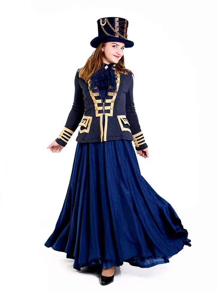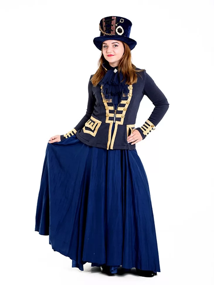 Цей елегантний жіночий костюм поєднує в собі витончену класику та елементи стимпанк-естетики. Насичені відтінки синього з золотим декором створюють ефектність образу, що ідеально підходить для театральних виступів, вечірок або фентезійних фотосесій. Образ витриманий, стильний, і разом з тим — з легкою іронічною ноткою пригодниці з майбутнього.
