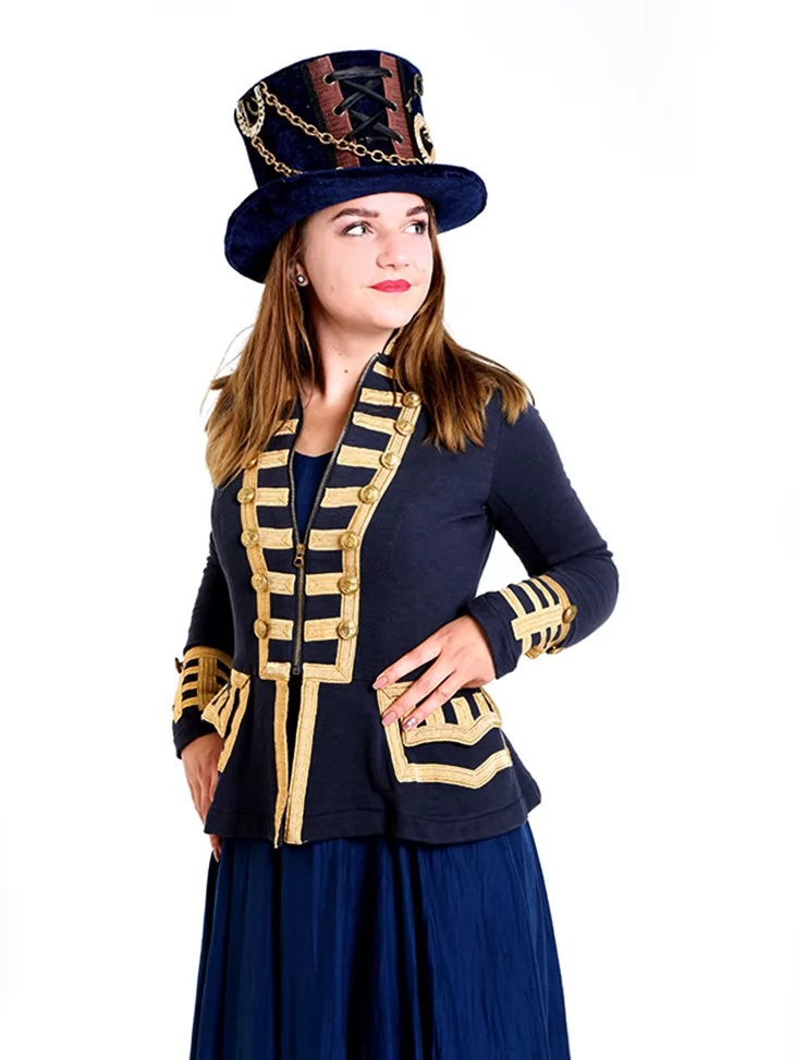 – синій жакет із контрастною золотою обробкою, оздоблений декоративними гудзиками