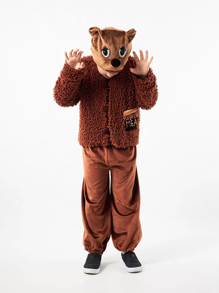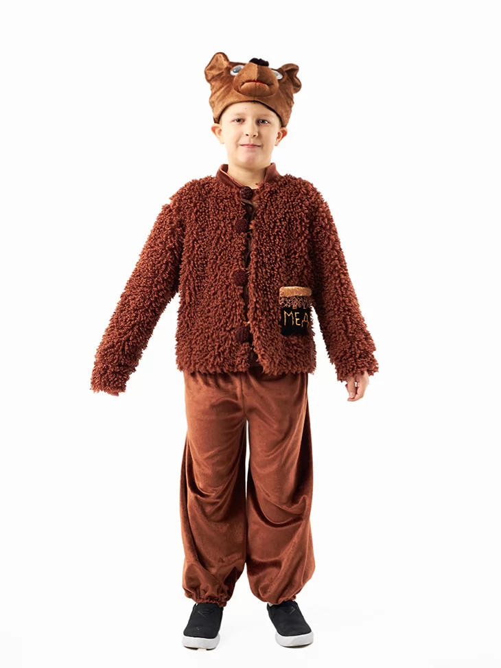 Цей милий та затишний образ одразу викликає усмішку й асоціюється з добрим казковим ведмедиком із лісової галявини. М’яка фактура тканини, природний коричневий відтінок і кумедна шапка з ведмежою мордочкою створюють впізнаваного персонажа. Чудовий вибір для оренди карнавальних костюмів на дитячі ранки, тематичні вистави та святкові заходи.