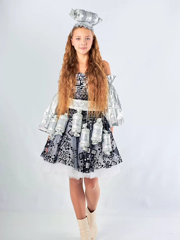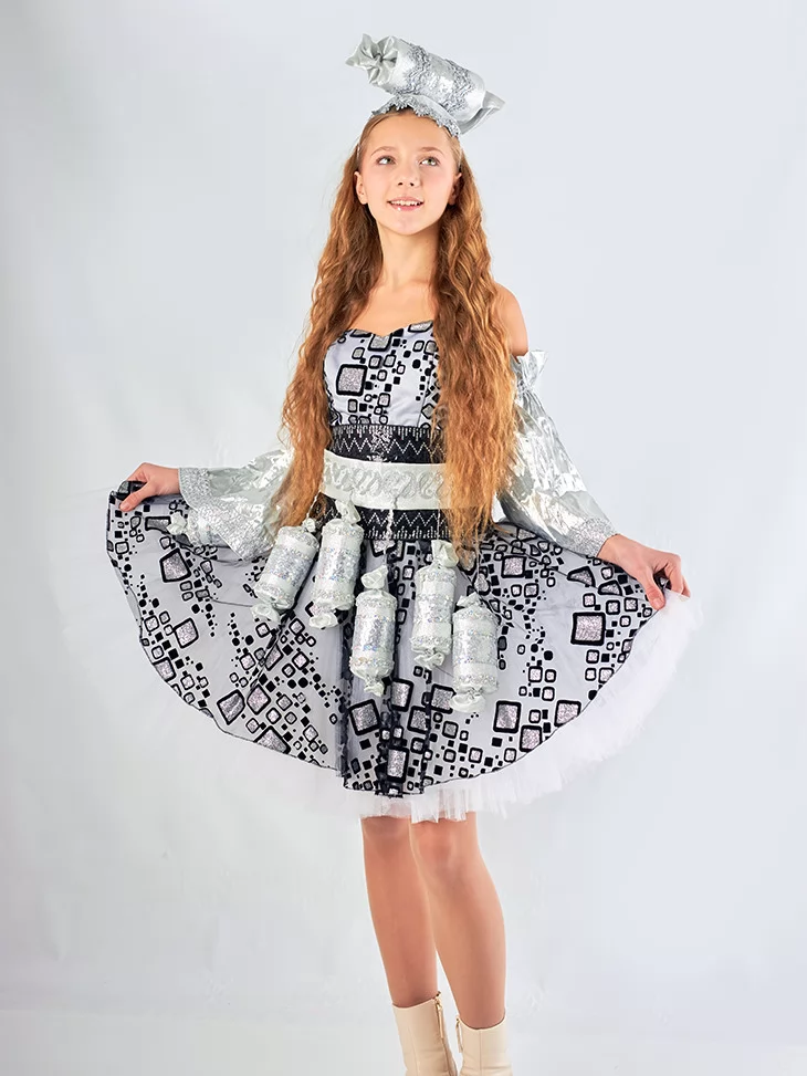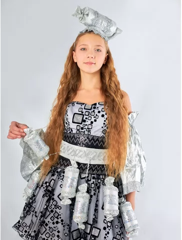 Незвичайний та яскравий образ, що нагадує чарівну солодку цукерку з казкової країни. Сріблясті відтінки, блискучі деталі та декоративні елементи у вигляді цукерок створюють веселий і дуже фотогенічний образ. Такий костюм чудово підходить для оренди карнавальних костюмів на дитячі свята, виступи та тематичні події.