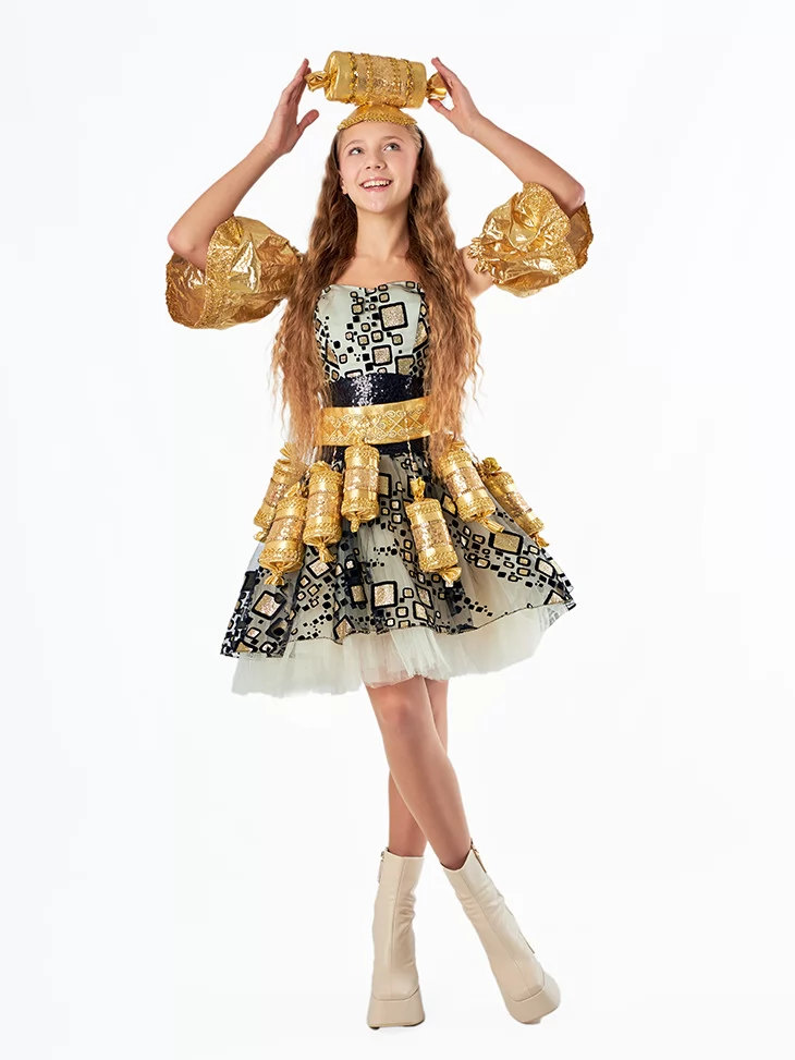 Яскравий, блискучий та дуже оригінальний образ, що нагадує казкову золоту цукерку з чарівної країни солодощів. Поєднання золотих відтінків, декоративних цукерок та святкового блиску створює ефектний сценічний костюм. Такий образ стане чудовим вибором для оренди карнавальних костюмів на виступи, дитячі свята та тематичні події.