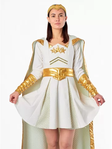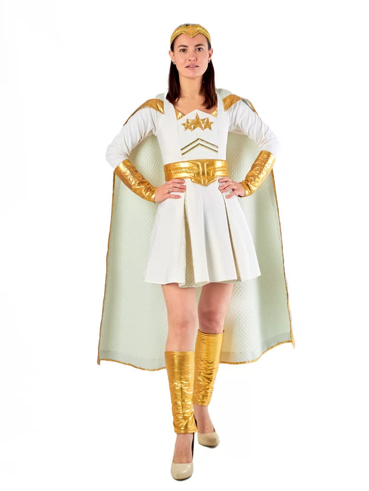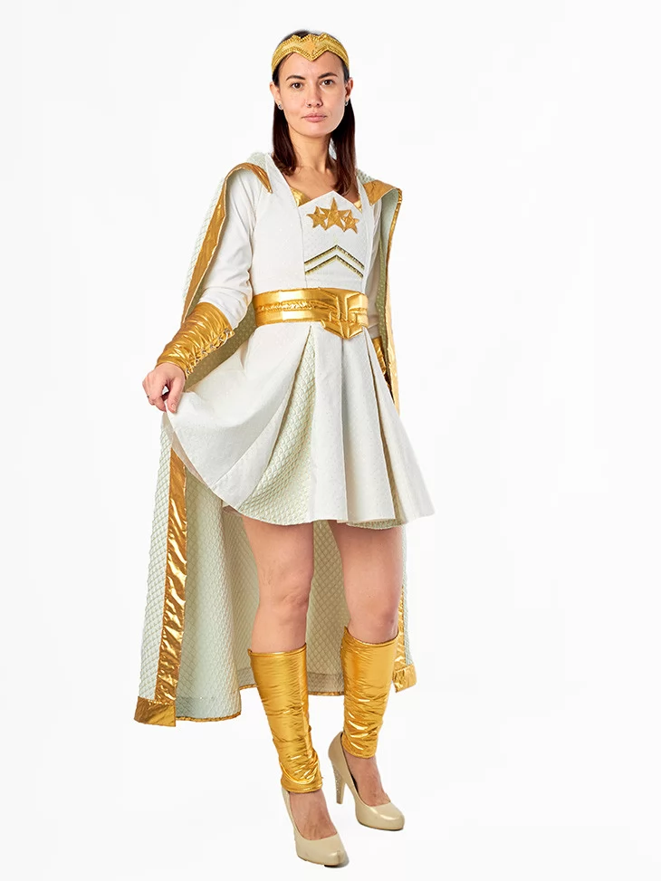 Костюм «Старлайт Зірочка» — це стильна адаптація образу супергероїні Старлайт із культового серіалу «Хлопаки». Він поєднує в собі благородство, силу й сяйво, завдяки чому кожна поява в ньому — це вибух світла й енергії. Білосніжна тканина з золотими акцентами, розкльошена спідниця та довгий плащ створюють динамічний, яскравий образ. Цей костюм — ідеальне рішення для вечірок, Comic Con, фотосесій і тематичних свят. Завдяки послузі оренда карнавальних костюмів ви можете приміряти образ справжньої супергероїні та зачарувати всіх присутніх своєю харизмою.
