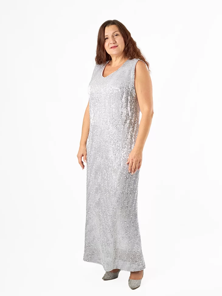 – довга срібляста сукня з паєтками, що виблискують на світлі