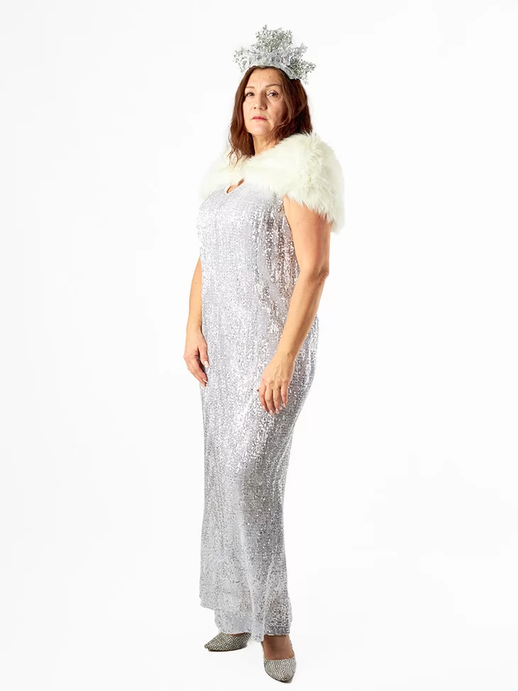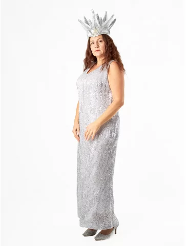 Костюм «Снігова Королева Срібного Сяйва» — витончений образ для королеви зимового балу. Срібляста сукня в підлогу, рясно прикрашена паєтками, створює ефект інею, що мерехтить на світлі. Елегантна хутряна накидка додає тепла та аристократичного шарму, а крижана корона з мереживних сніжинок завершує образ справжньої володарки зими. Цей варіант особливо підійде для новорічних заходів, театральних виступів, фотосесій у стилі фентезі або ролі зимової чарівниці. Оренда карнавальних костюмів дозволяє створити вражаючий образ без необхідності купівлі.