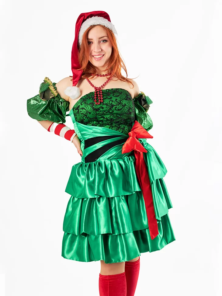 Відчуйте атмосферу новорічної казки в образі чарівної помічниці Санти! Костюм «Ельфійка Святкова Стрічка» — це святковий мікс блиску, стилю та гумору, що гарантовано зробить вас зіркою будь-якої події. Яскраво-зелена сукня з багатоярусною спідницею та червоним бантом підкреслює новорічну тематику, а контрастні аксесуари додають образу завершеності. Скористайтесь сервісом оренда карнавальних костюмів, щоб створити яскравий образ без потреби купувати одяг на один раз.