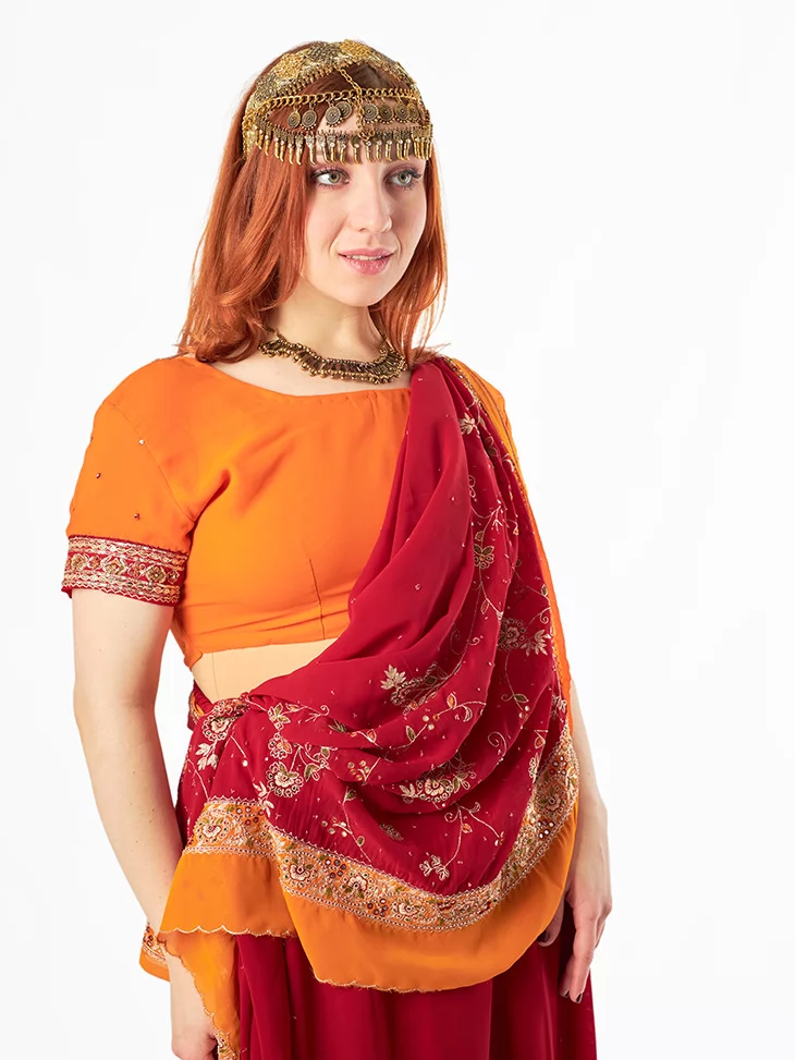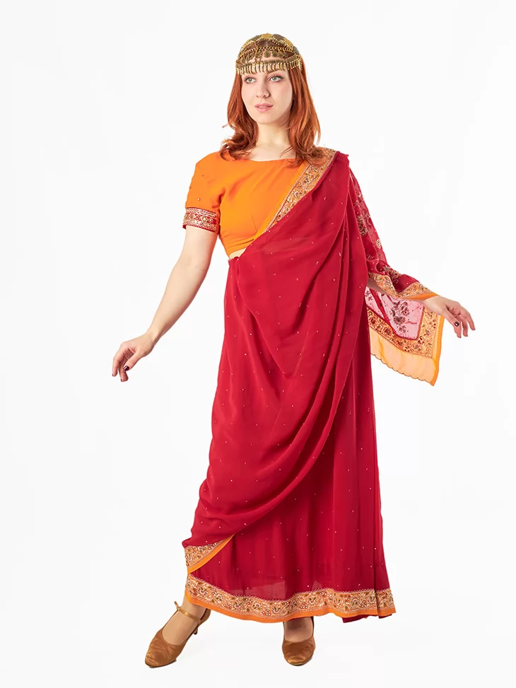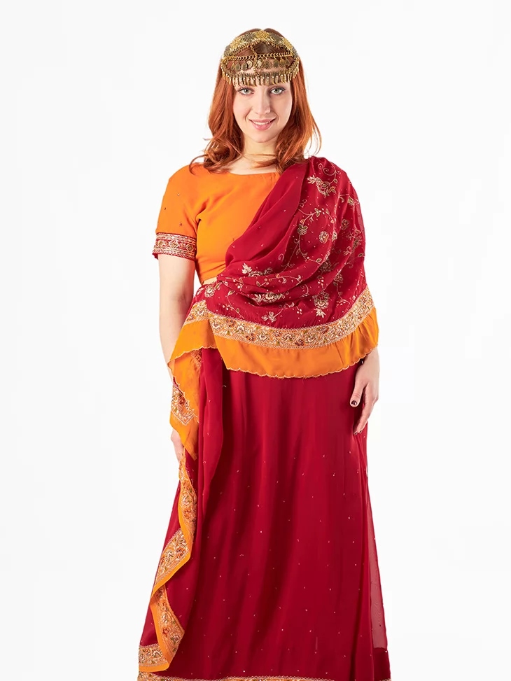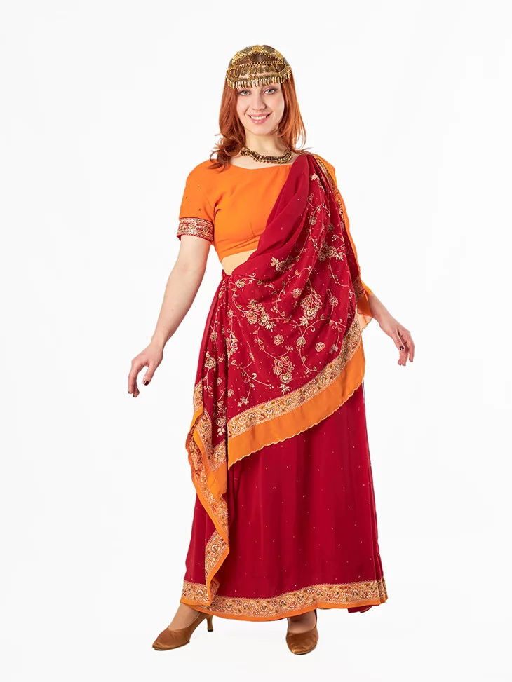 Цей яскравий костюм натхненний святковими індійськими традиціями. Поєднання насичених кольорів, вишивки та мерехтливих деталей створює неповторний образ східної богині. Завдяки послузі оренда карнавальних костюмів ви можете легко перевтілитись у героїню боллівудського танцю або величної індійської принцеси.