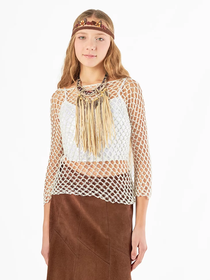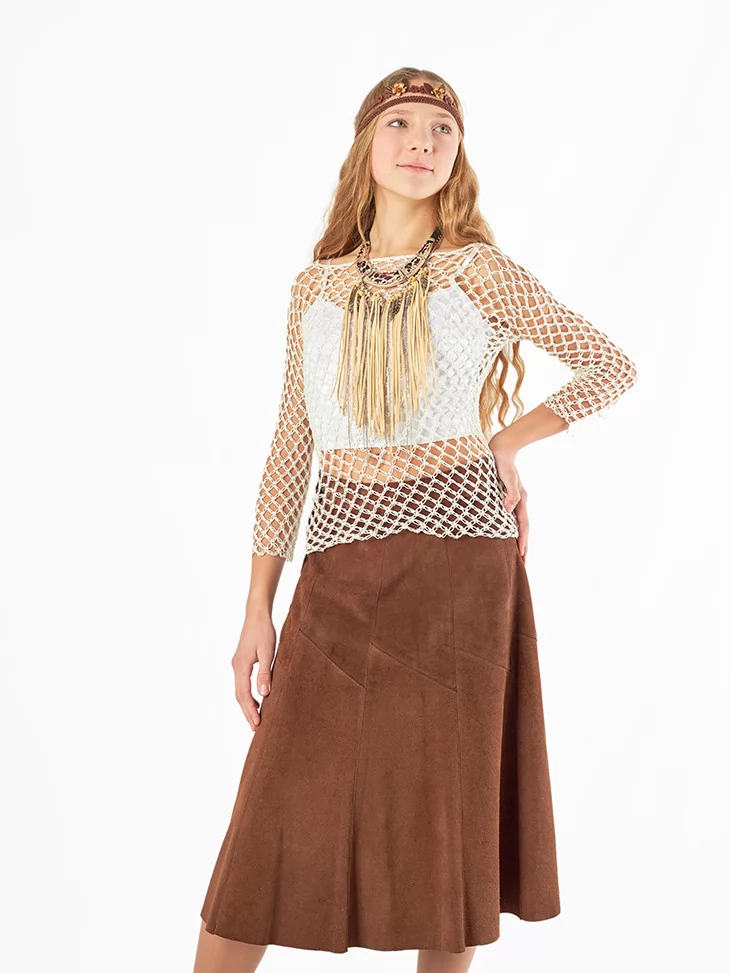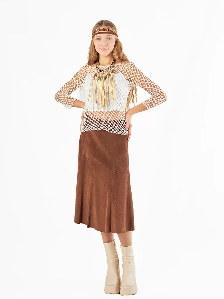 Цей образ натхненний культурою корінних народів і свободою життя поруч із природою. Легка сітчаста кофта у поєднанні з довгою спідницею створює м’який, гармонійний силует, а багатошарове намисто з бахромою додає руху й характеру. Пов’язка на голову завершує образ, роблячи його автентичним і впізнаваним. Це вдалий варіант для оренди карнавальних костюмів, коли хочеться етнічного настрою та природної естетики.